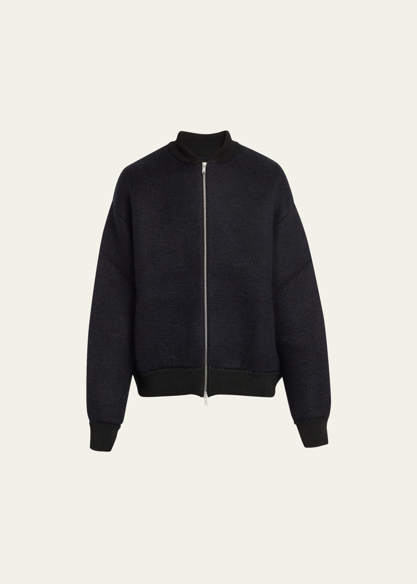 Jil Sander Black knit bomber jacket Baseball collar; two-way front zip Dropped shoulders Long sleeves Ribbed cuffs and hem Wool/viscose/mohair Dry clean Made in Italy