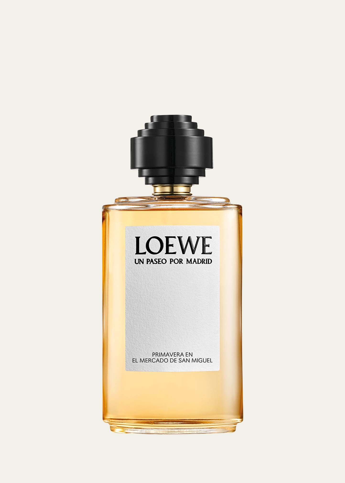 Loewe Mercado San Miguel Eau de Parfum 2021, 3.4 oz. San Miguel market is a historic and monumental place, featured in countless literary works. Located in the heart of Madrid's old town, the area which best reflects the city's personality, the market is an explosion of sensations and colors under a beautiful wrought iron structure. This Eau de Parfum encapsulates this favorite setting for Madrilenians and tourists alike who become entranced by the aromas of bergamot, p.