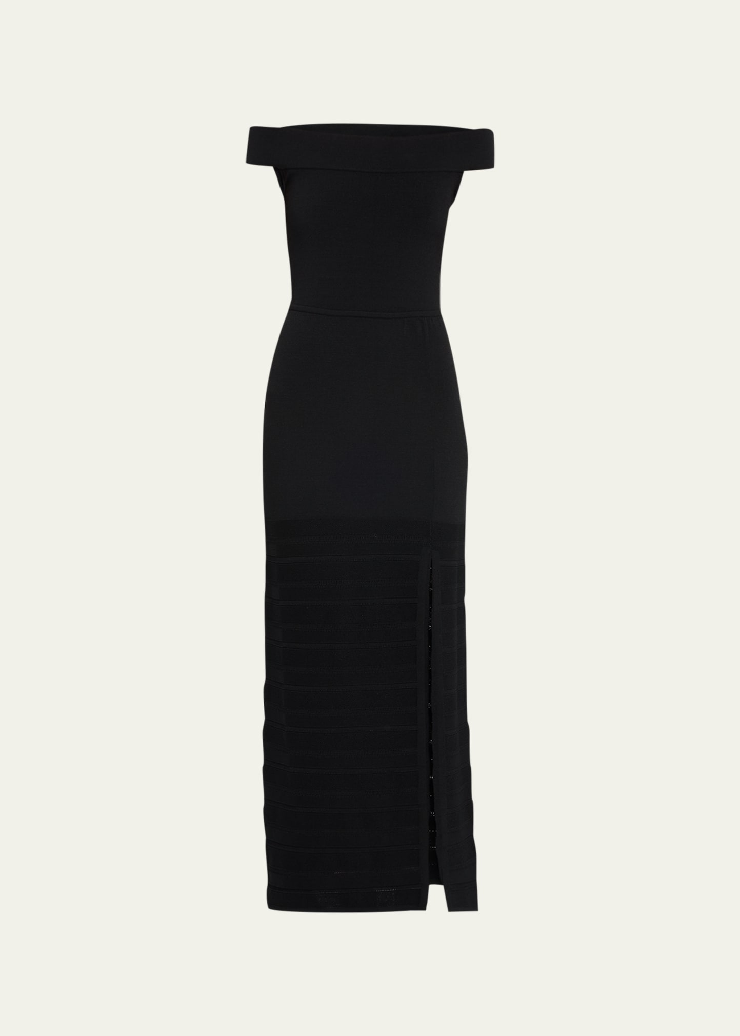 Ciao Lucia "Mercede" knit maxi dress featuring an off-the-shoulder neckline and thigh-high slit Sleeveless Column silhouette Full length Slipover style Viscose/nylon/polyamide Imported