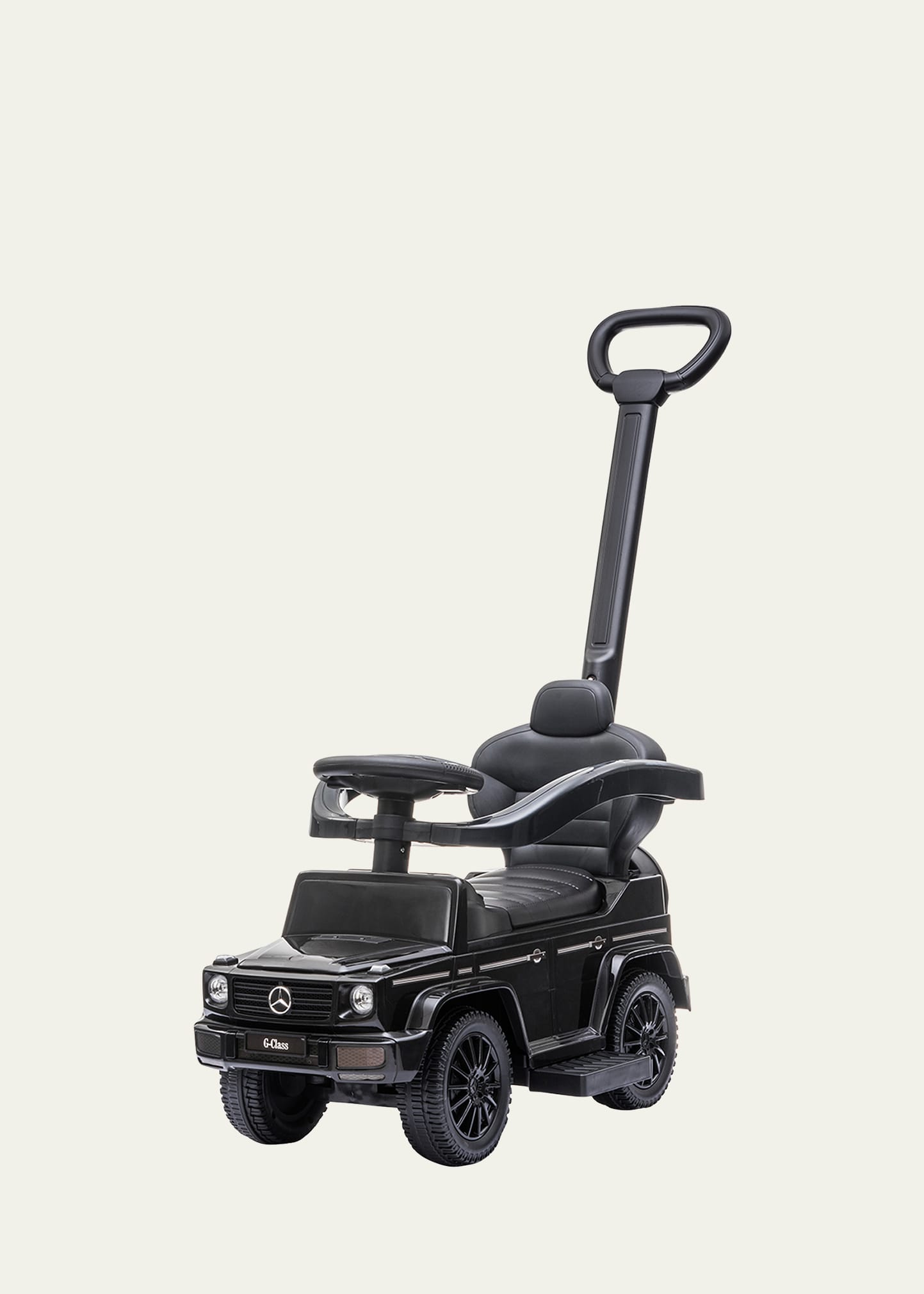 Officially licensed Mercedes-Benz G-wagon 3-in-1 push car is suitable for kids from 12 months to 3 years old This vehicle pulls triple duty as a stroller, walking car, and a riding car This push car has a removable stroller handle, foot rest, and hand rails Also features music and horn sounds. Approx. 33.66"L x 16.0"W Item Weight (Lbs.): 11.8 Plastic Wipe clean Imported