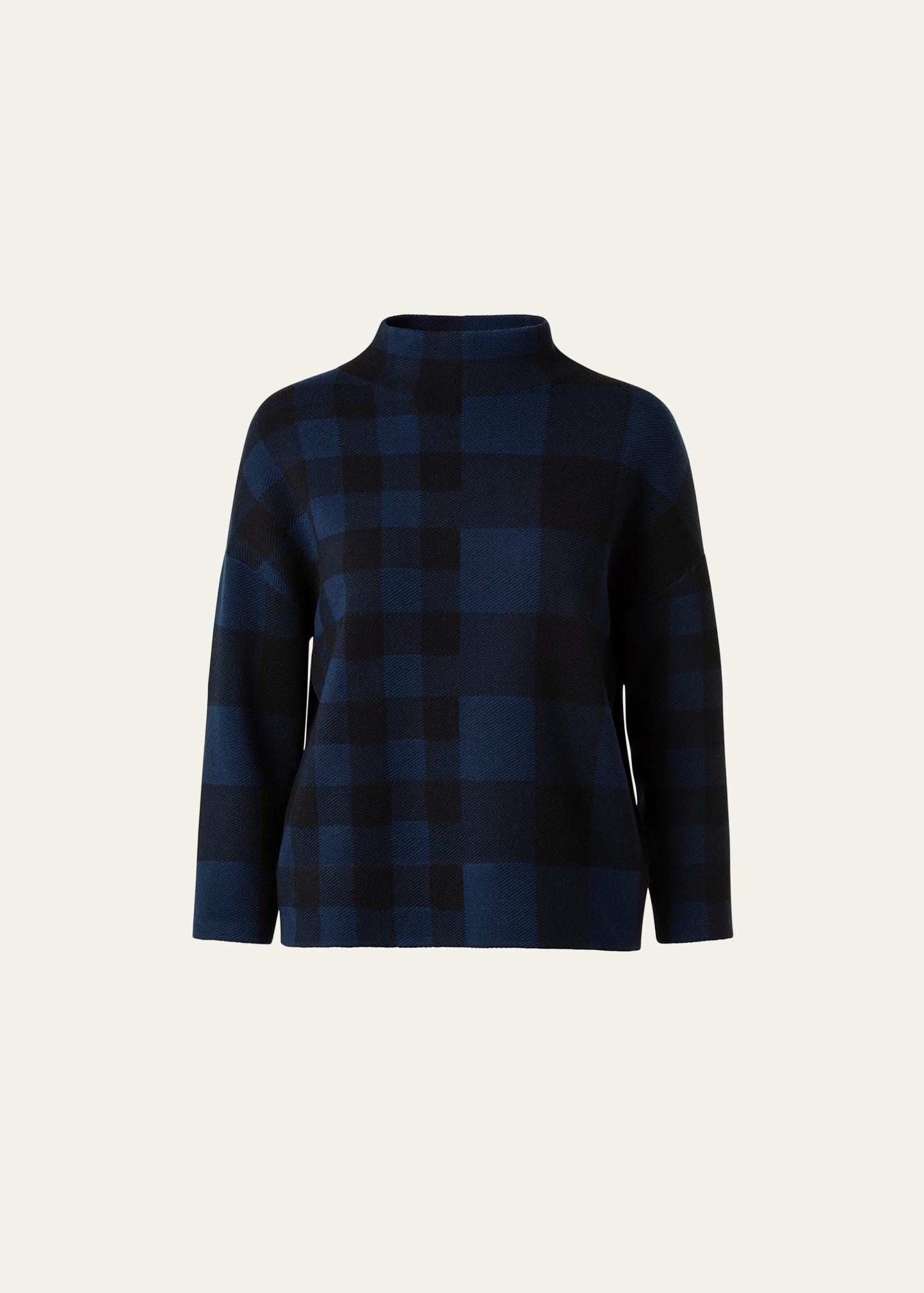 Akris punto knit sweater in gingham jacquard Funnel collar Dropped shoulders Bracelet sleeves Boxy fit Pullover style Merino wool Imported