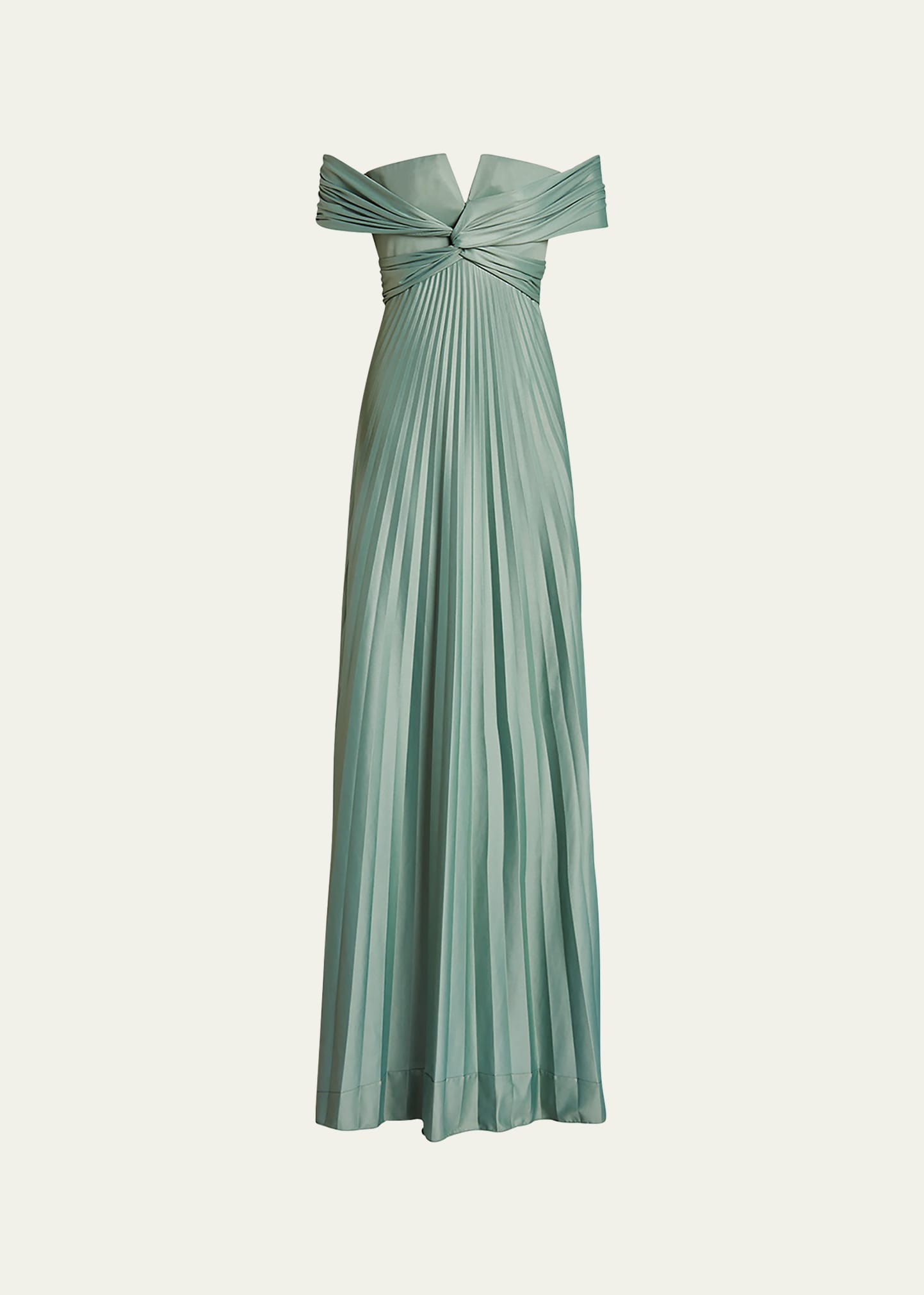 Ralph Lauren Collection "Merridan" gown featuring a twisted bodice and pleated skirt Off-the-shoulder neckline Short sleeves A-line silhouette Floor sweeping hem Invisible back zip Viscose/polyester/elastane Dry clean Made in Italy