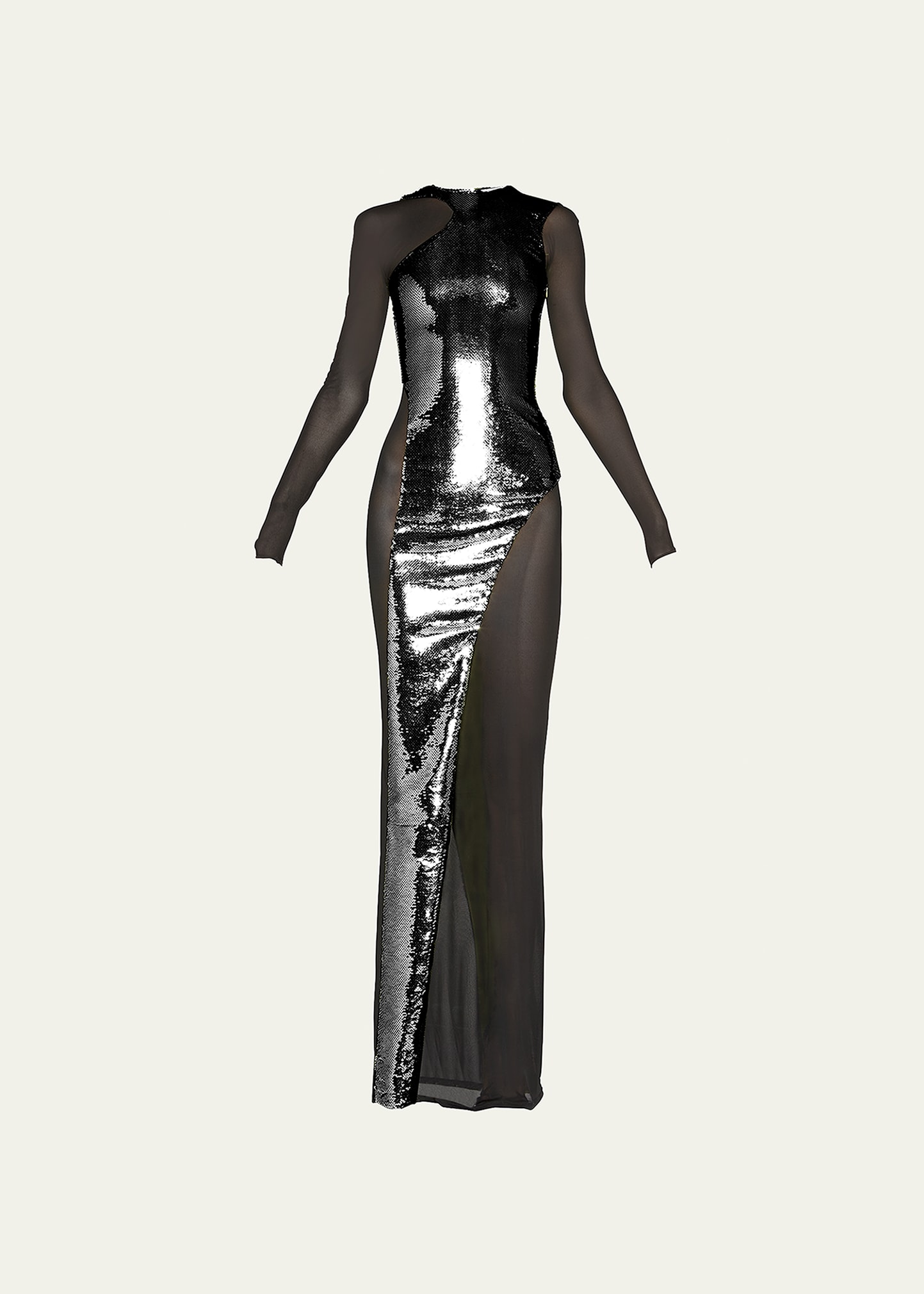 TOM FORD evening dress with liquid sequin embellishments throughout and mesh panels Crew neckline Long sleeves Side zip closure Full length Column silhouette Polyester/polyamide/elastane Lining: Silk Made in Italy
