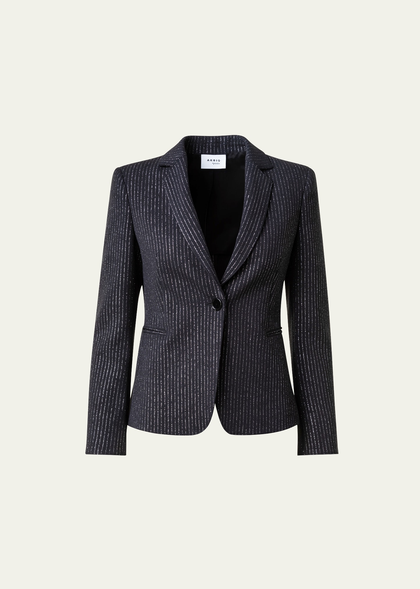 Akris punto blazer jacket features metallic pinstripe details on pebble crepe Single-breasted front Notched lapel collar Long sleeves; split cuffs Jetted front welt pockets Hip length Fitted silhouette Polyester/viscose Made in Romania