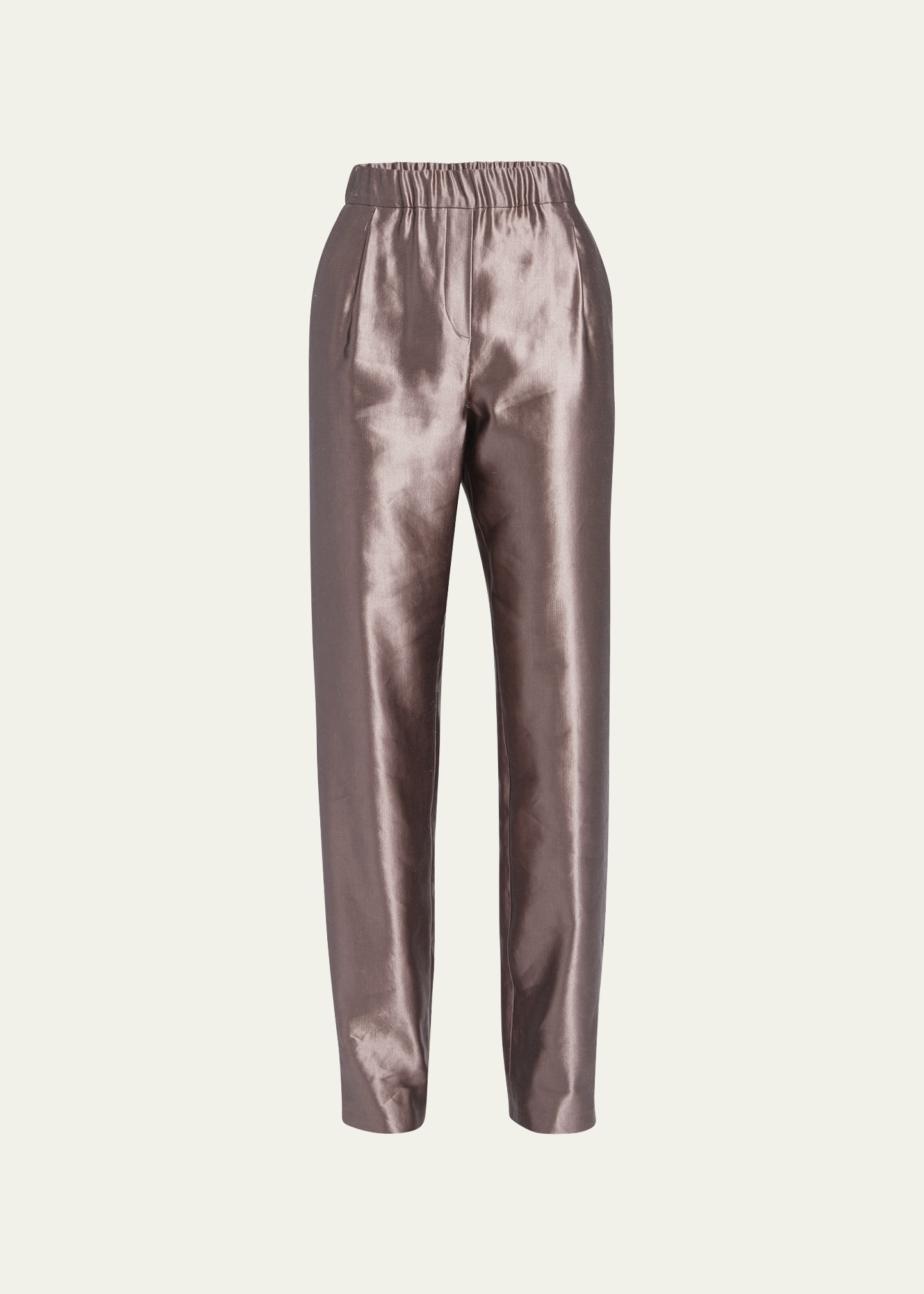 Giorgio Armani Metallic silk trousers featuring an elasticized waistband Mid rise sits high on hip Pleated front Side slip pockets; back welt pockets Straight legs Full length Pull-on style Linen/silk Dry clean Made in Italy