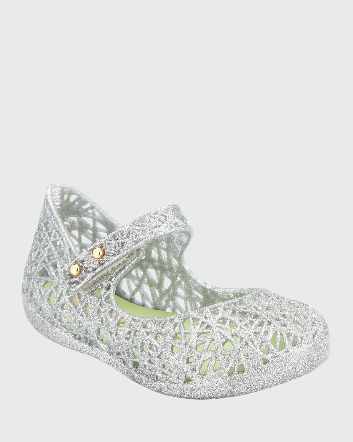 Melissa Shoes Mary Jane flat. Waterproof high quality shear plastic upper and outsole. Sustainably made from MELFLEX nontoxic, hypoallergenic, cruelty-free thermoplastic that molds comfortably to feet. Subtly scented with their Melissa signature tutti-frutti fragrance. Round toe. Mary Jane grip-strap with golden hardware. Cushioned footbed. Textured outsole for traction. "Mini Campana Zigzag VI" is made in Brazil.