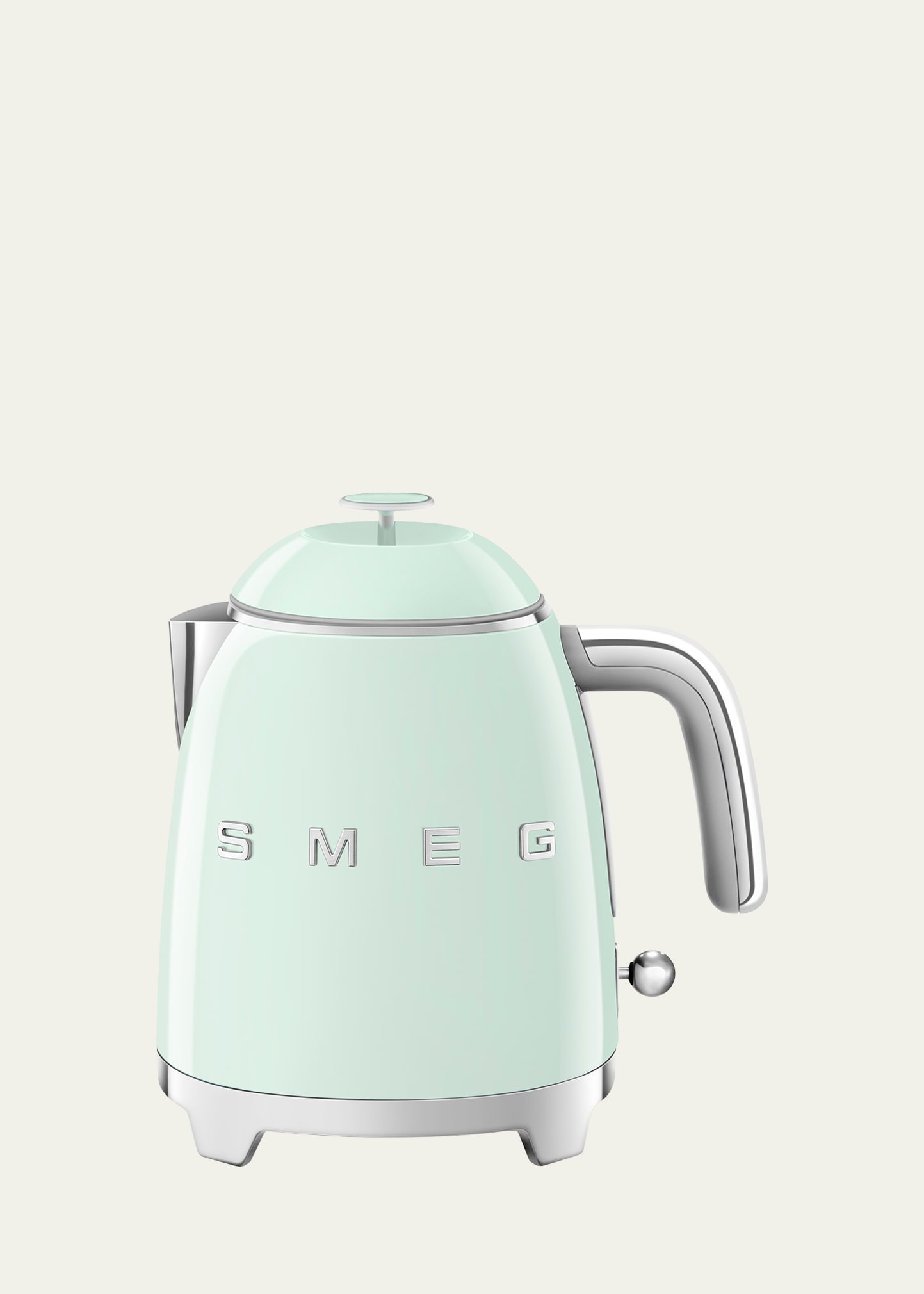 50's Retro style mini kettle in stainless steel. Integrated stainless steel water filter. Internal water level indicator. Double-wall structure. Capacity: 0.8 L (3 cups). Minimum quantity: 0.2 L. Power: 1,400W. Approx. 8"Dia. x 6"T. Imported.
