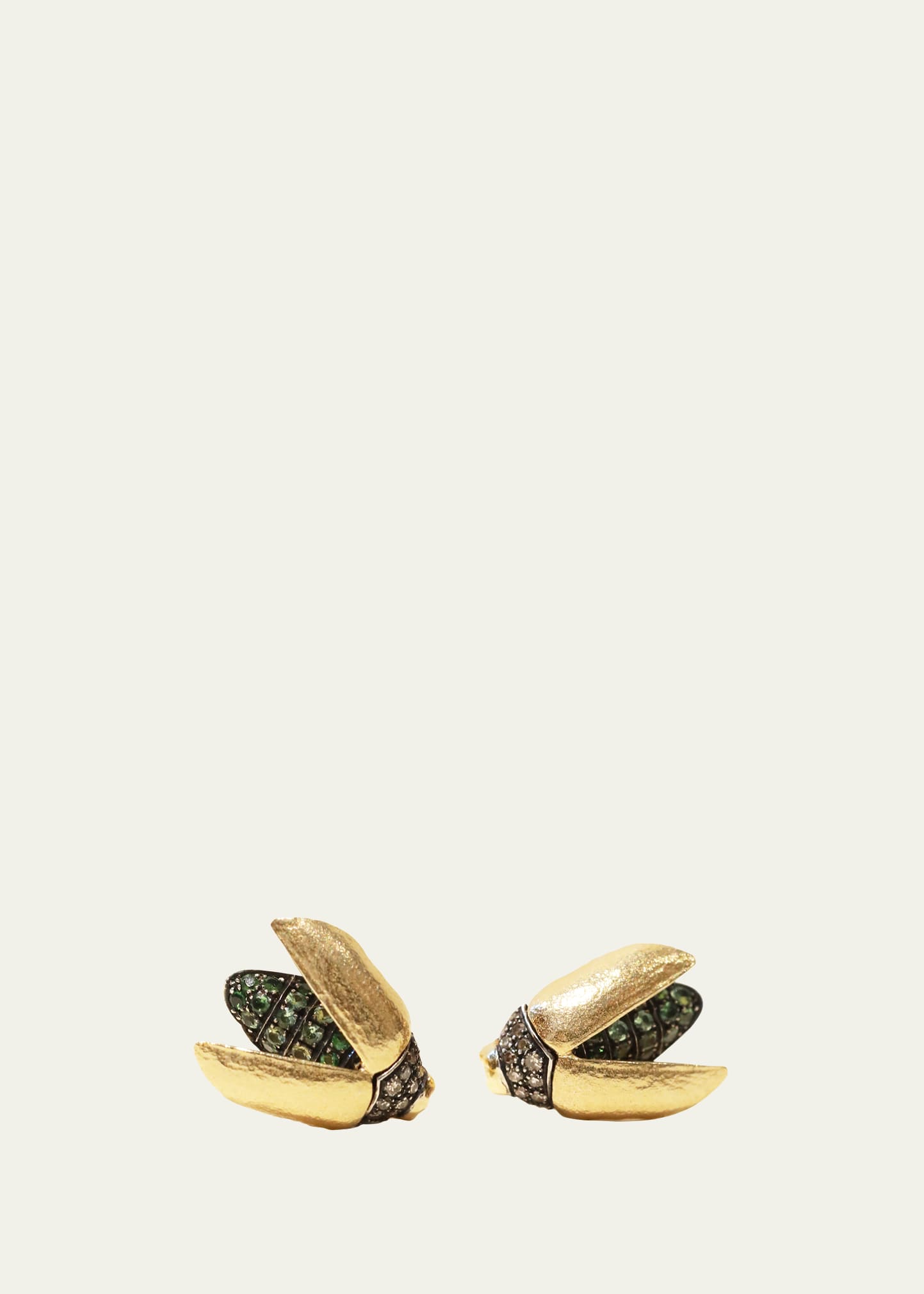 Bibi van der Velden mini scarab stud earrings 18-karat yellow gold and sterling silver Adorned with tsavorite and brown diamonds 0.105 total diamond carat weight For pierced ears Imported
