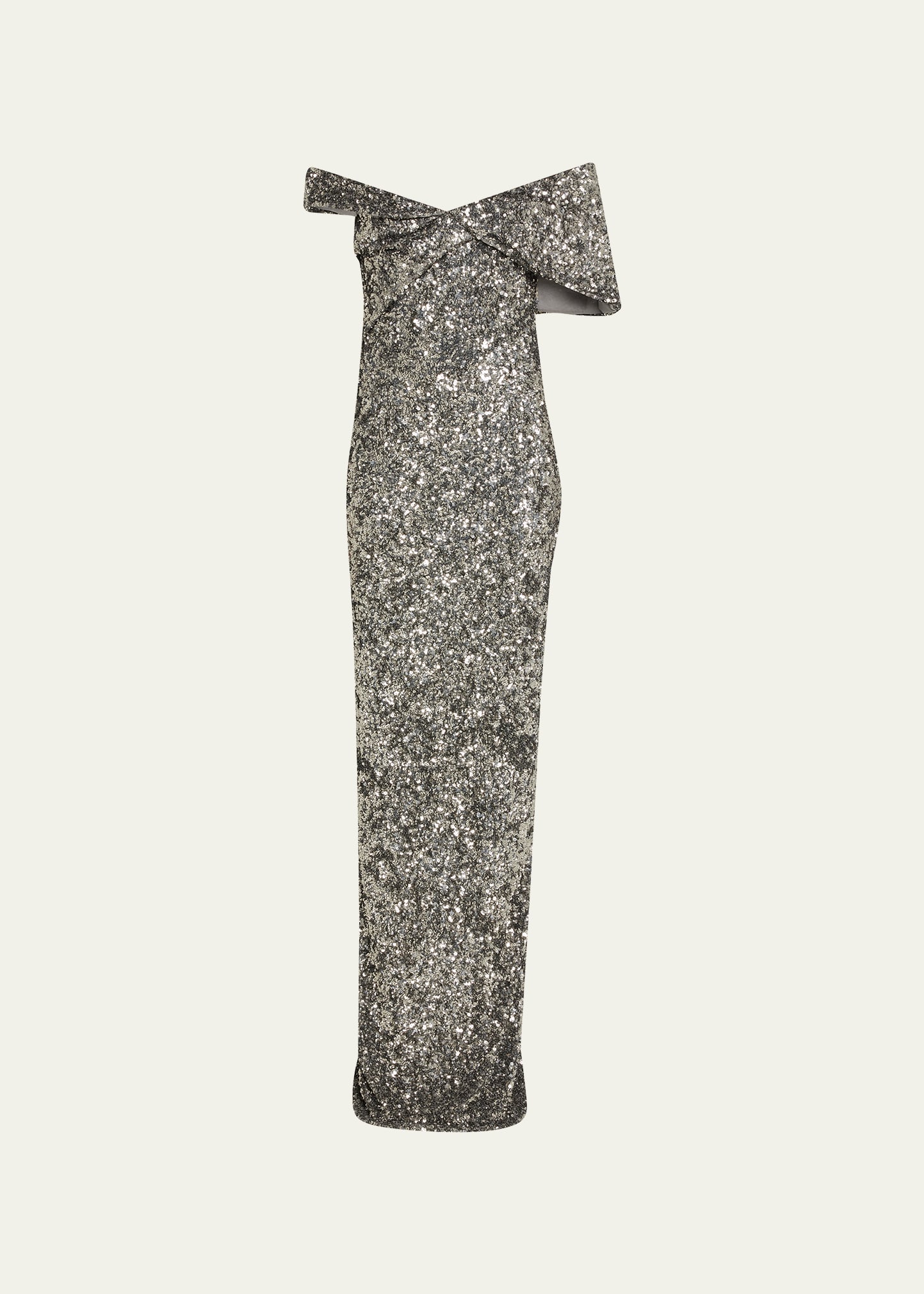 Rachel Gilbert "Mirella" gown in allover sequin embellishment Off-the-shoulder neckline Sleeveless Column silhouette Full length Vented back Back zip Nylon self/lining Dry clean Imported