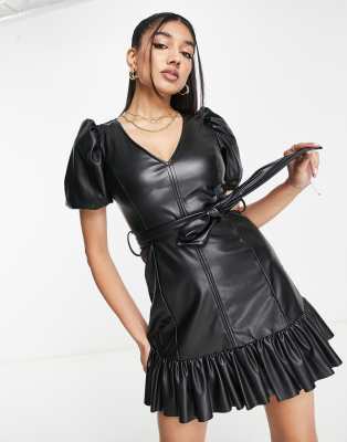 Petite by Miss Selfridge Petite The scroll is over V-neck Puff sleeves Tie waist Regular fit