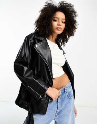 Miss Selfridge petite longline faux leather biker jacket in black
