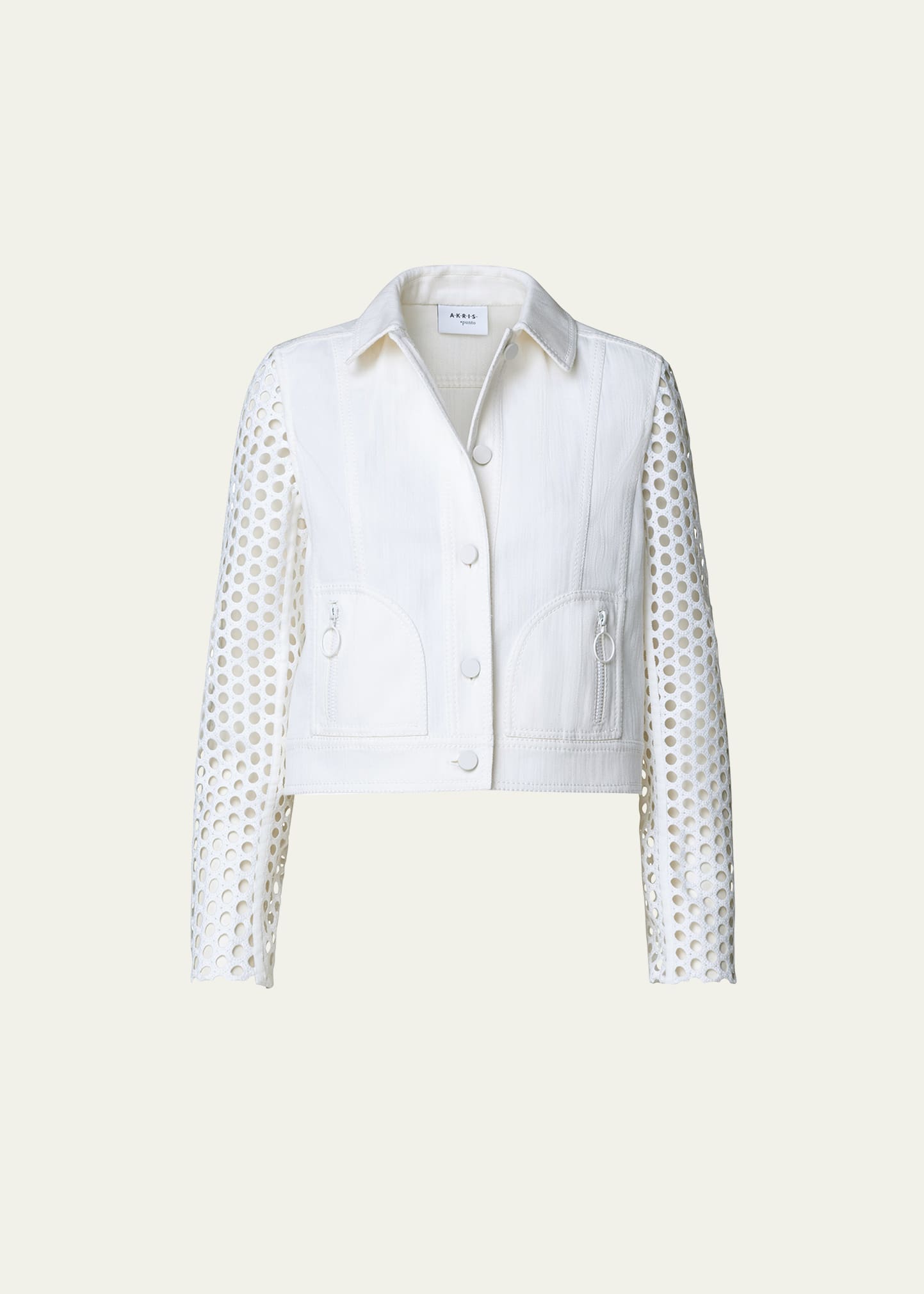 Akris punto mixed media denim jacket with dotted mesh guipure sleeves Spread collar Button front Long sleeves Front zip pockets Hip length Relaxed fit Cotton/spandex Lining: Cupro Made in Romania