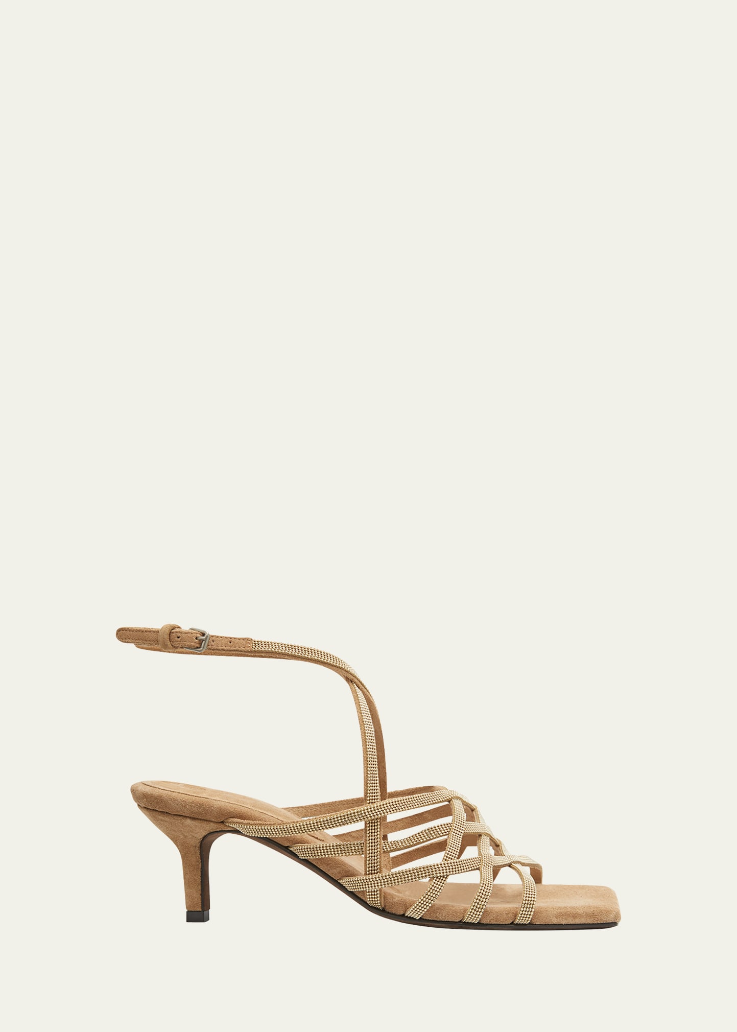Brunello Cucinelli sandals in suede with monili trim 2.25 in / 55 mm kitten heel Squared open toe Caged vamp Adjustable slingback strap Made in Italy