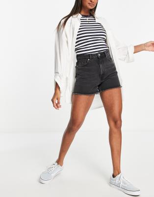 Denim shorts by Monki Make some leg room High rise Belt loops Five pockets Frayed hem Regular fit