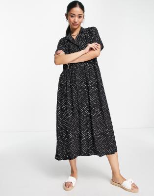 Midi dress by Monki The scroll is over Polka-dot print Camp collar Button-up front Short sleeves Oversized fit