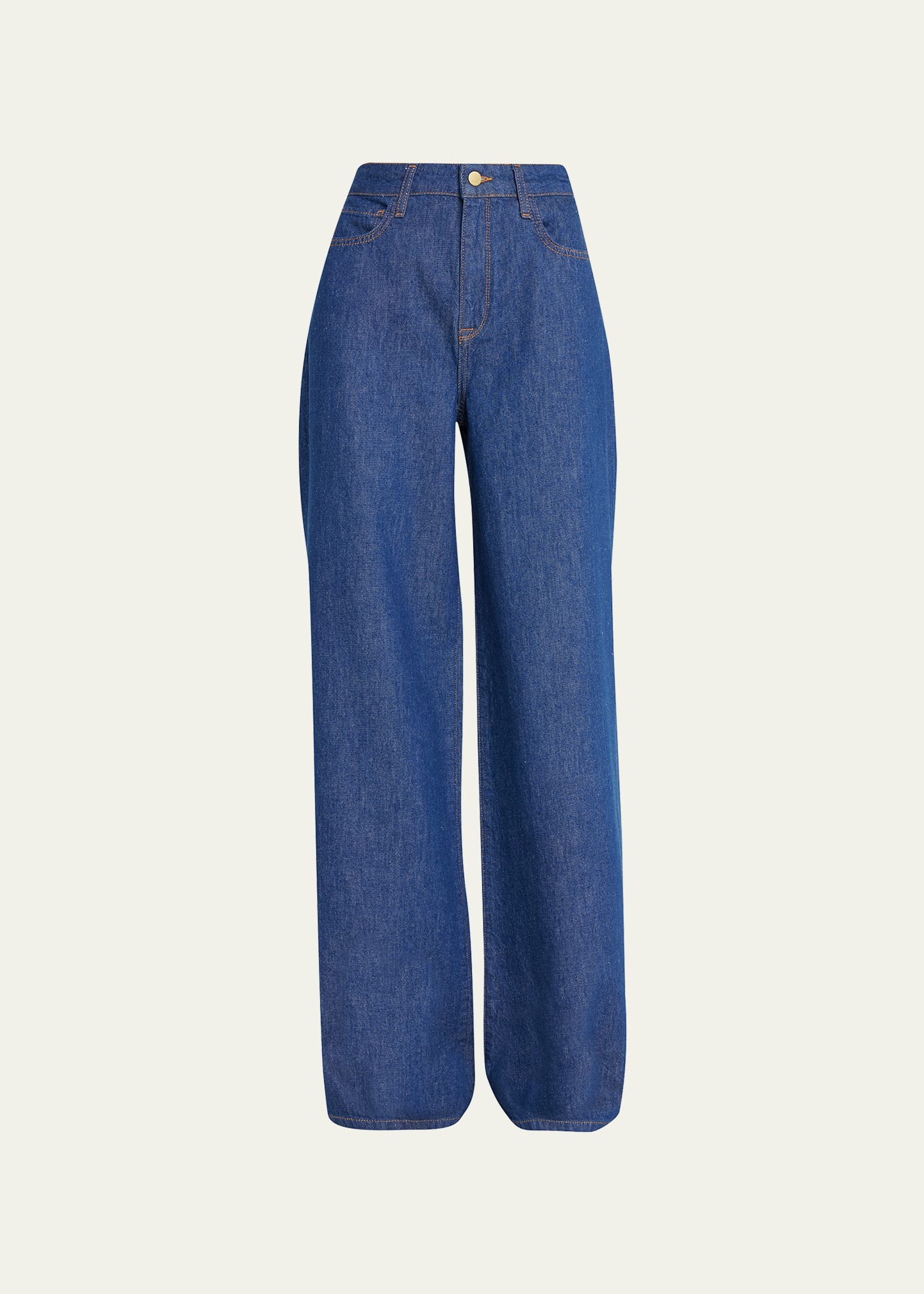 Triarchy "Ms. Fonda" wide-leg jeans in medium-wash denim All of our jeans and denim jackets are produced with responsibly made fabrics and washed with the most advanced sustainable laundry technology available Five-pocket style High rise Loose fit Full length Button/zip fly; belt loops Cotton Dry clean Imported