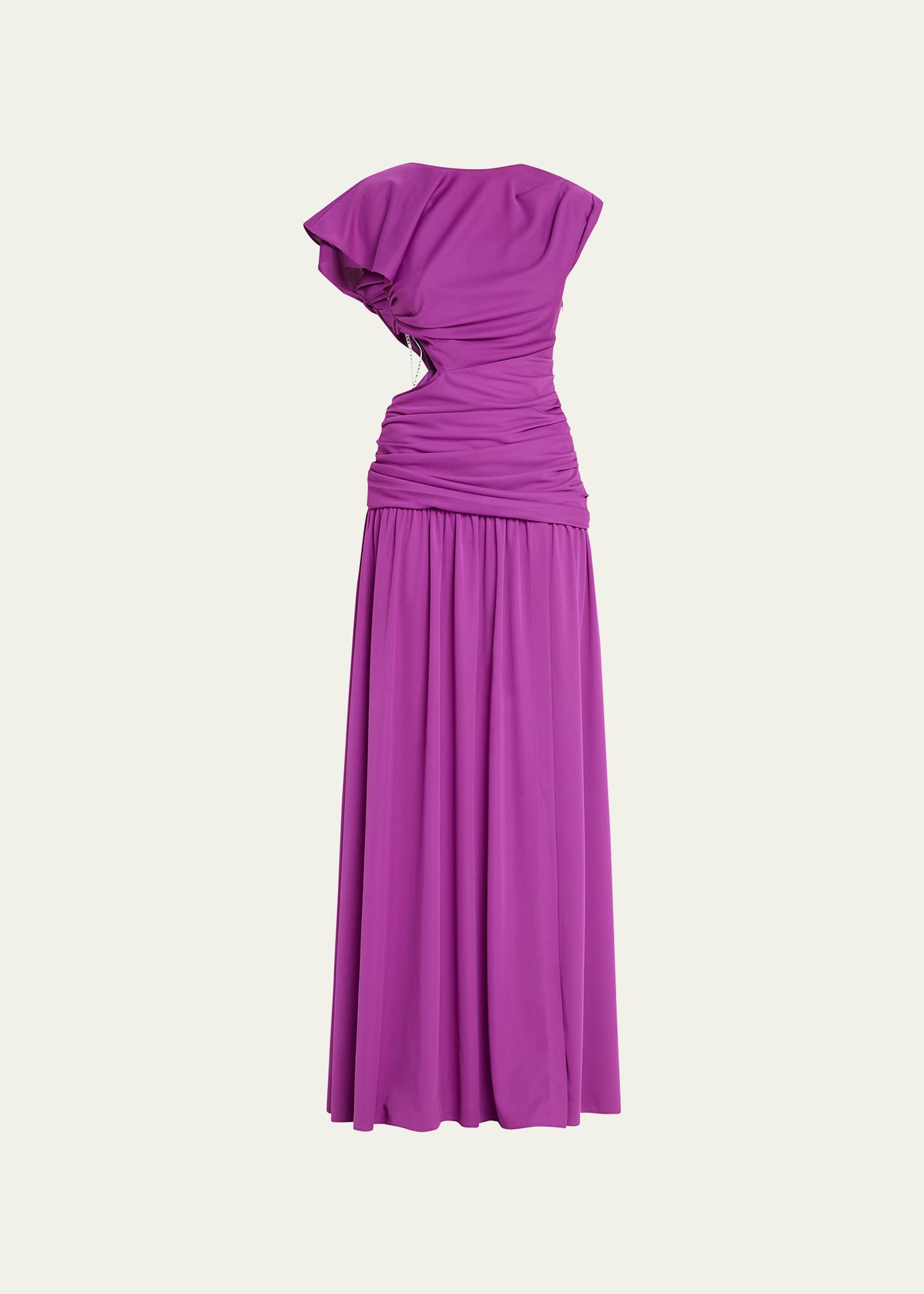 Tanya Taylor "Nami" gathered matte jersey dress punctuated by waist cutouts Approx. 58.5"L from shoulder to hem Asymmetric boat neckline Short sleeves; approx. 8.0"L Dropped waist Side slit Maxi length A-line silhouette Polyester Unlined Dry clean Imported