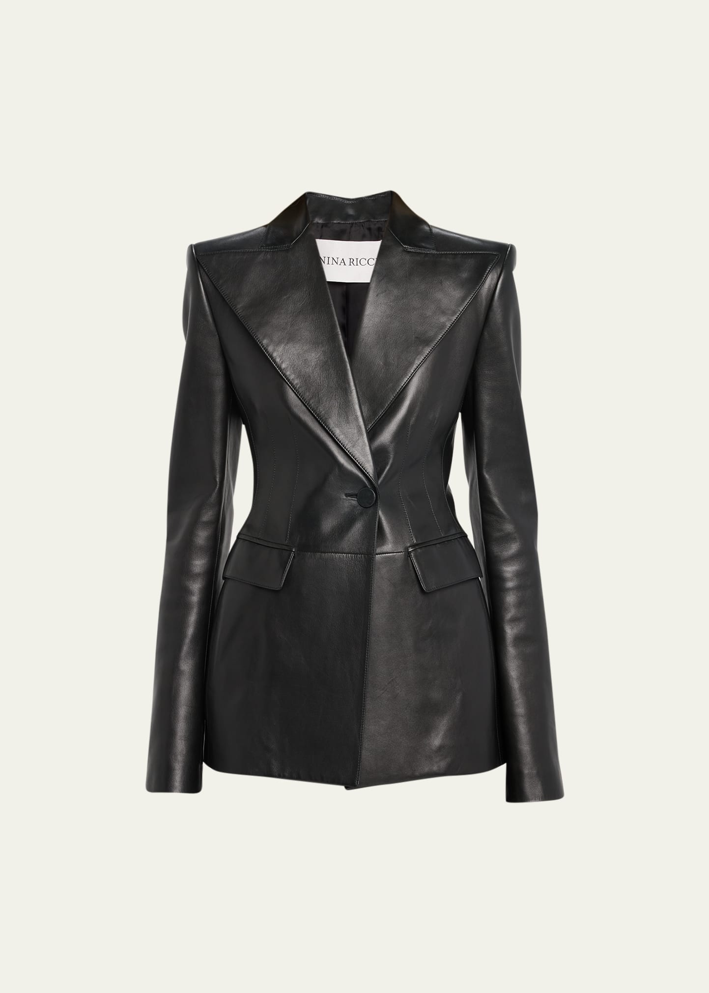 Nina Ricci napa lambskin leather blazer Peak lapels; button front Long sleeves; button cuffs Hip flap pockets Tailored fit Imported