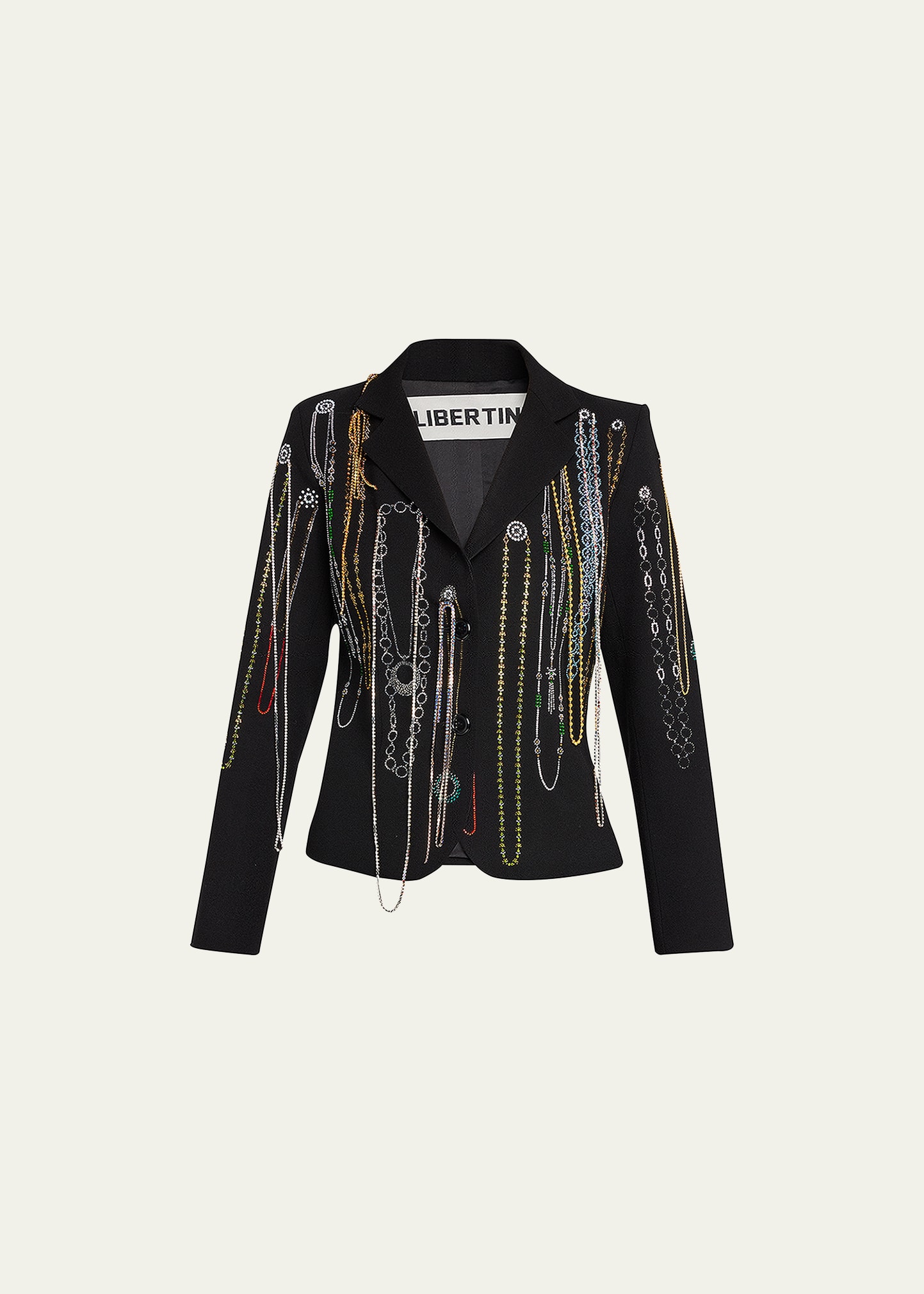 Libertine "Necklace Gallery" clean long sleeve short jacket with necklace-style crystal embellishments all over Approx. 22.25"L from shoulder to hem Notched collar Button front Hip length Tailored fit Wool Lining: Polyester Dry clean Made in the USA