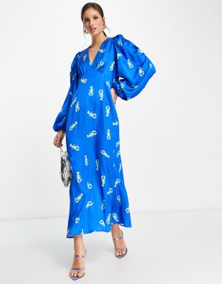 Never Fully Dressed exclusive balloon sleeve lobster midaxi dress in cobalt-Blue
