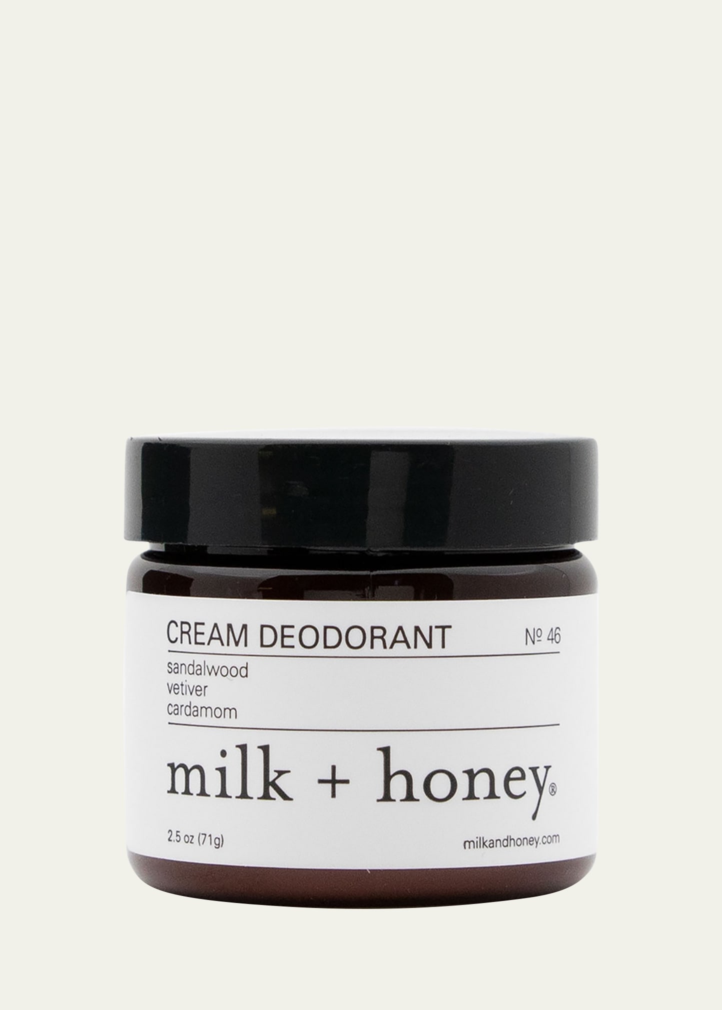 milk + honey No. 46 Cream Deodorant, 2.5 oz. Fresh. A calming blend of sandalwood, vetiver, and cardamom lends a grounding experience to this effective, aluminum-free deodorant. How to Use: Warm a pea-sized amount between your fingers and apply directly to your underarm area. 2.5 oz./ 71 g Ingredients*: Organic Coconut (Cocos nucifera) Oil, Organic Shea (Butyrospermum parkii) Fruit Butter, Sodium Bicarbonate, Organic Arrowroot (Maranta arundinacea) Root Powder, Organic Beeswax, Organic L.