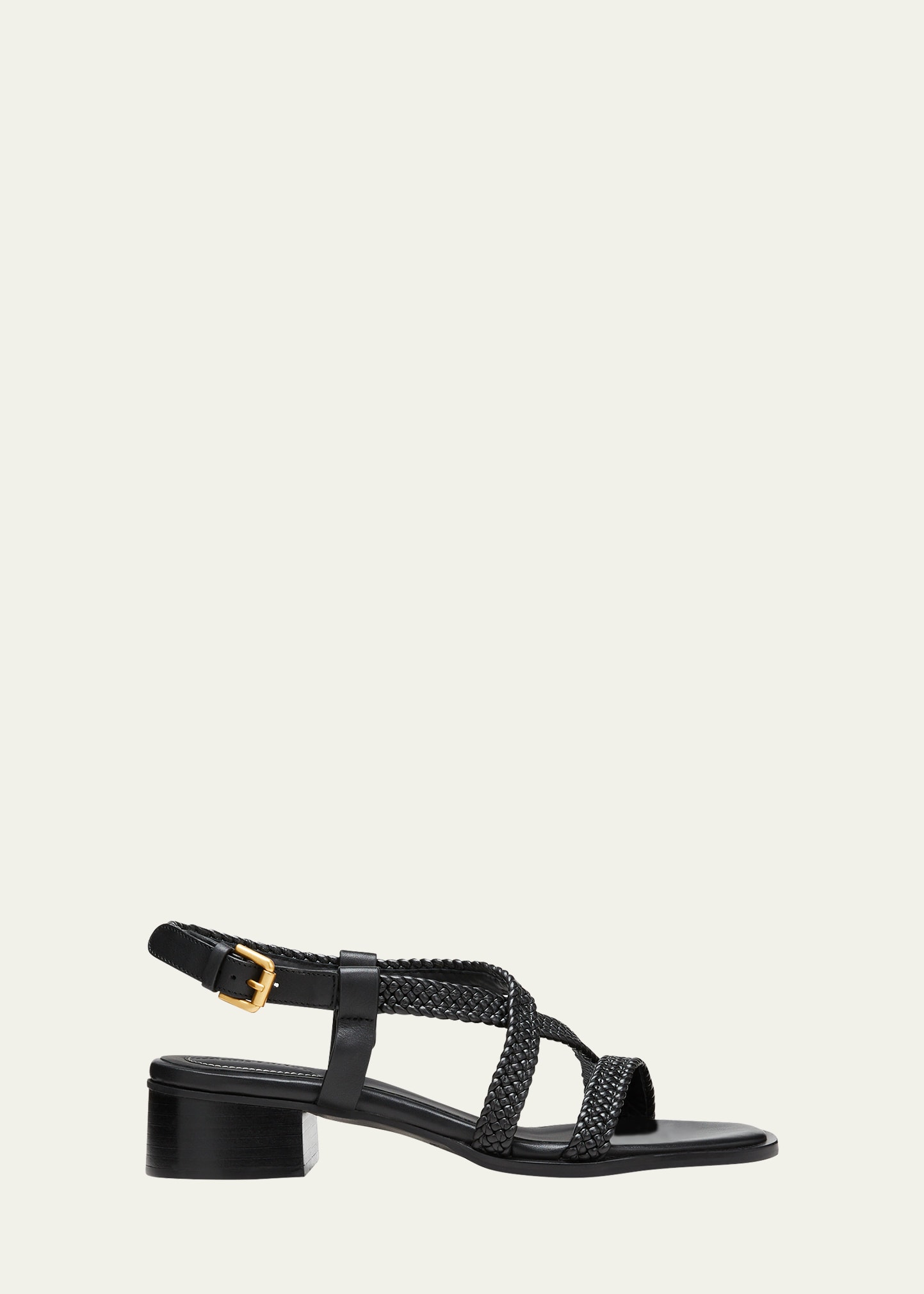 See by Chloe "Nola" sandals in polyurethane, polyester, and leather 1.50 in / 40 mm block heel Open toe Asymmetric braided straps Adjustable ankle strap with buckle closure Rubber outsole Imported