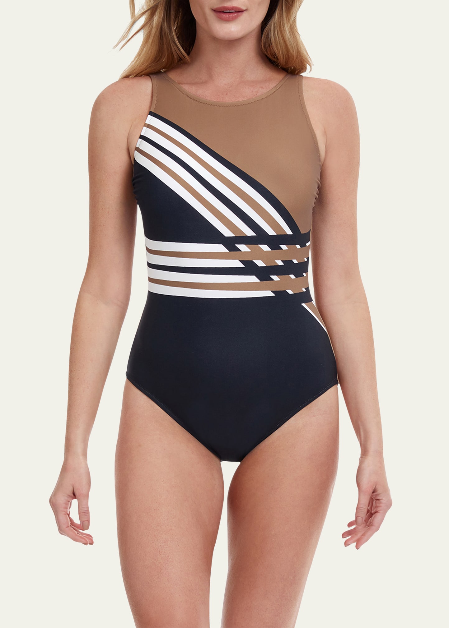 Gottex "Ocean Breeze" one-piece mastectomy swimsuit High neckline protects from the sun Soft cups Adjustable straps Full seat coverage Polyamide/elastane Hand wash Made in Morocco
