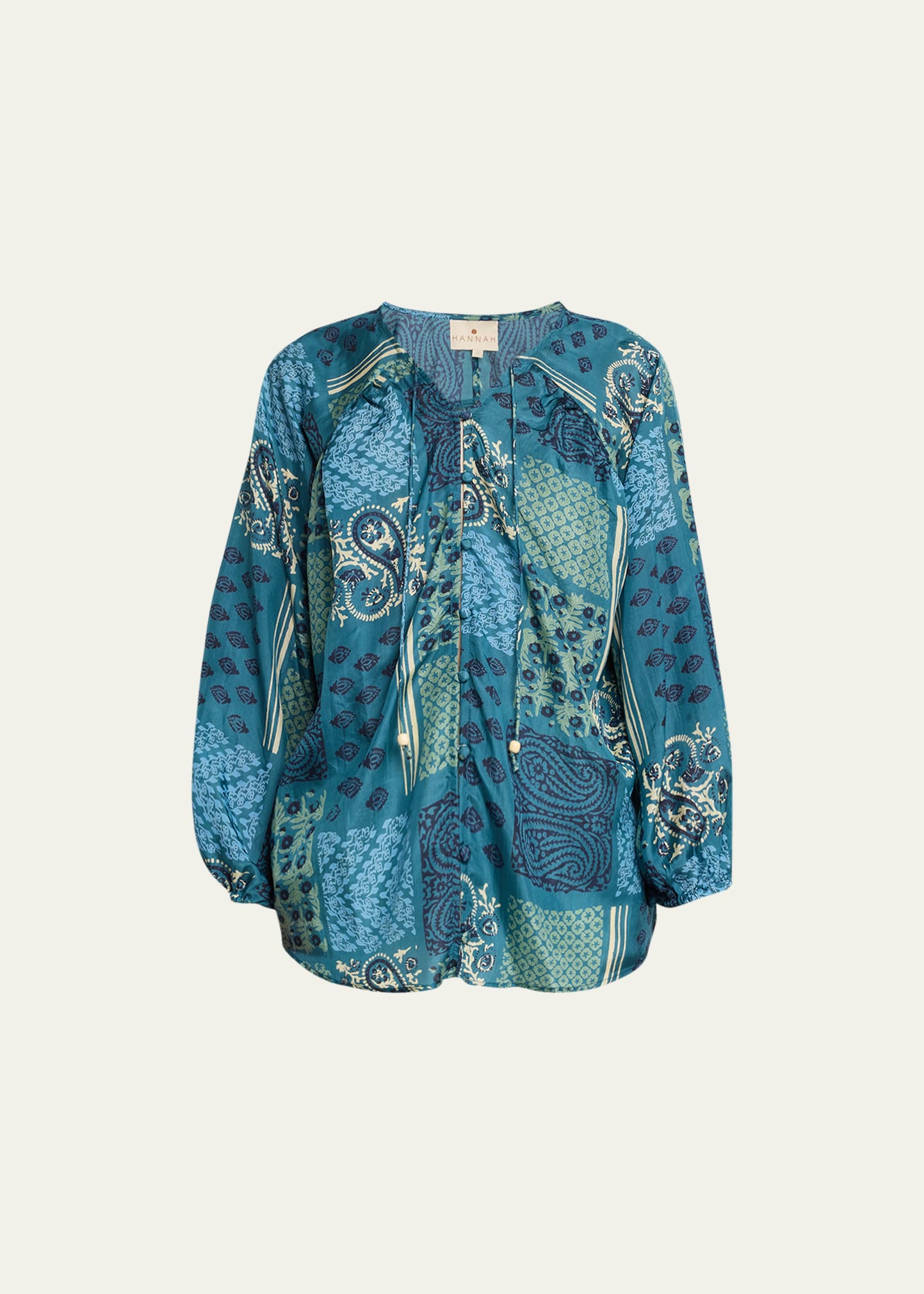 Hannah Artwear "Odette" blouse featured in a hand-block patchwork print Approx. 26"L from shoulder to hem Split neckline with ties Long raglan sleeves; approx. 24.5"L Fabric-covered button-front Straight, relaxed fit Hip length Silk Unlined Dry clean Imported