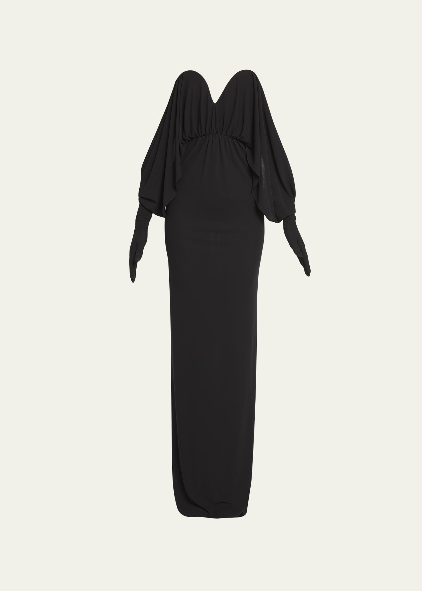 Saint Laurent off-shoulder gown features draped glove long sleeves Sweetheart neckline; plunge front Long sleeves Concealed back zip Full length Column silhouette Viscose/silk Made in Italy