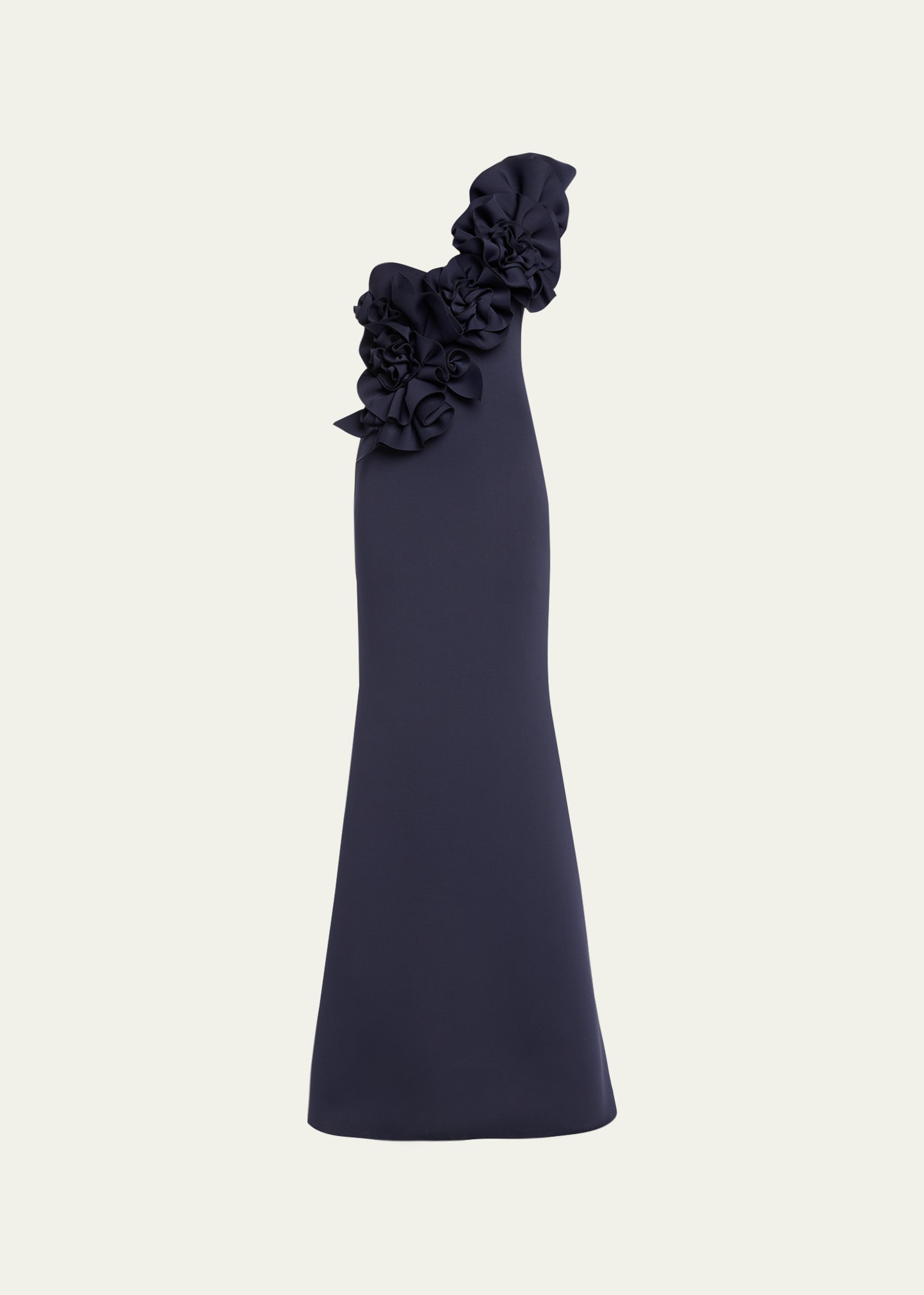 Badgley Mischka Collection scuba gown features ruffled rosettes One-shoulder neckline Sleeveless Side slit hem Full length Trumpet silhouette Invisible back zipper Polyester/spandex Lining: Polyester Dry clean Imported