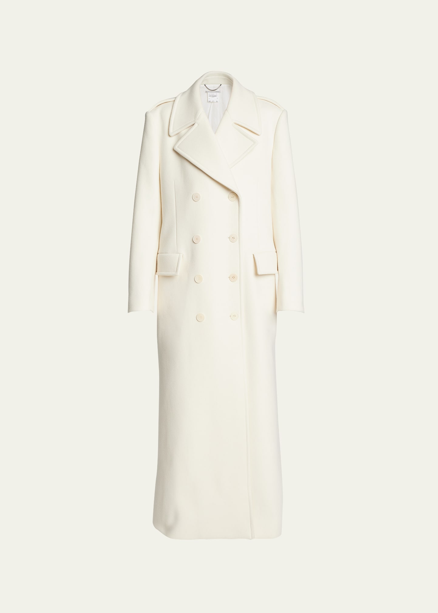 Stella McCartney oversized maxi trench coat in a wool-blend finish Double-breasted front Notched collar Two-row button front Long sleeves Front flap pockets Back center slit Full length Loose fit Wool/cotton/viscose Made in Poland