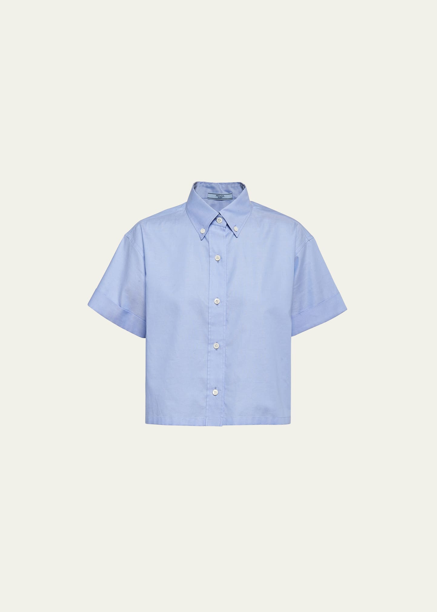 Prada Oxford shirt Button-down collar; button front Short cuffed sleeves Boxy fit Back yoke; box pleat Polyester/cotton Dry clean, professional cleaning recommended Made in Italy