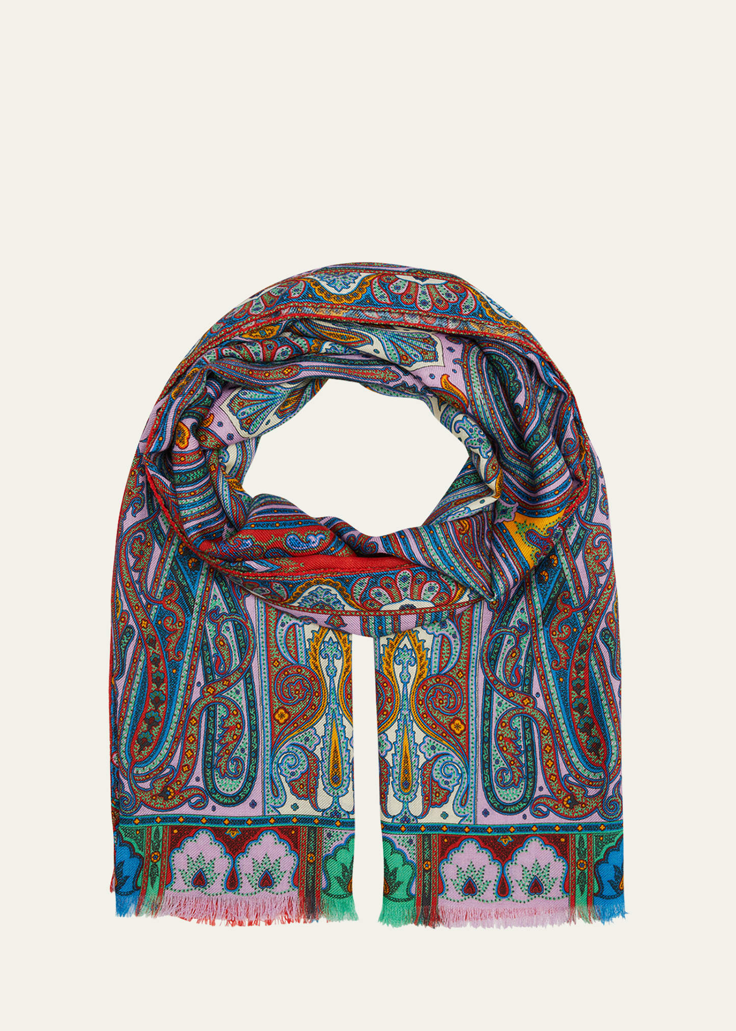 Etro paisley scarf in wool and silk Frayed trim Approx. 25.6"L May be styled multiple ways Professional cleaning recommended Made in Italy