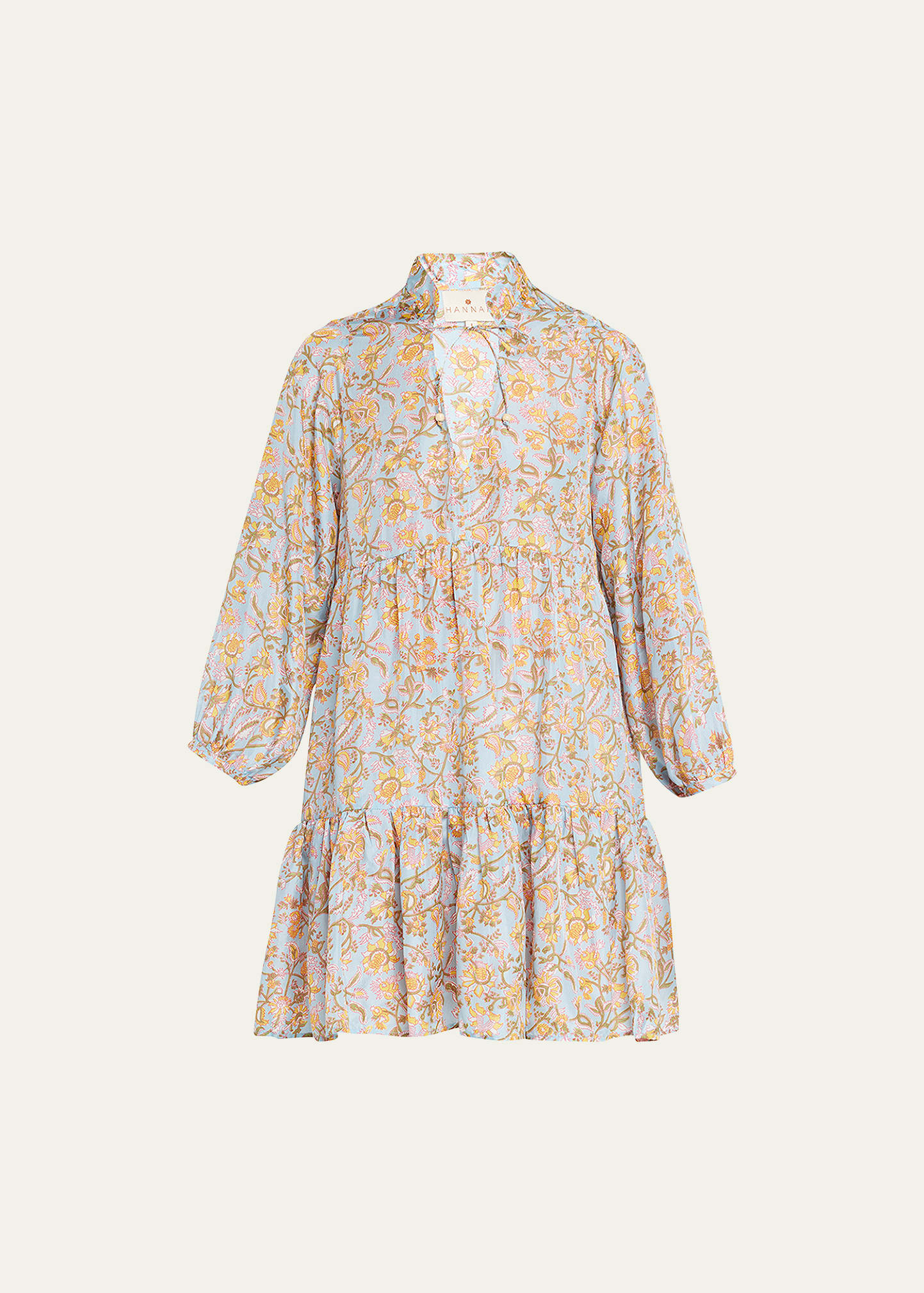 Hannah Artwear "Parsons" dress featured in an idyllic floral print Approx. 37"L from shoulder to hem V neckline; front ties Three-quarter sleeves; approx. 21.0"L Tiered skirt Mini length A-line silhouette Slipover style Silk Unlined Imported