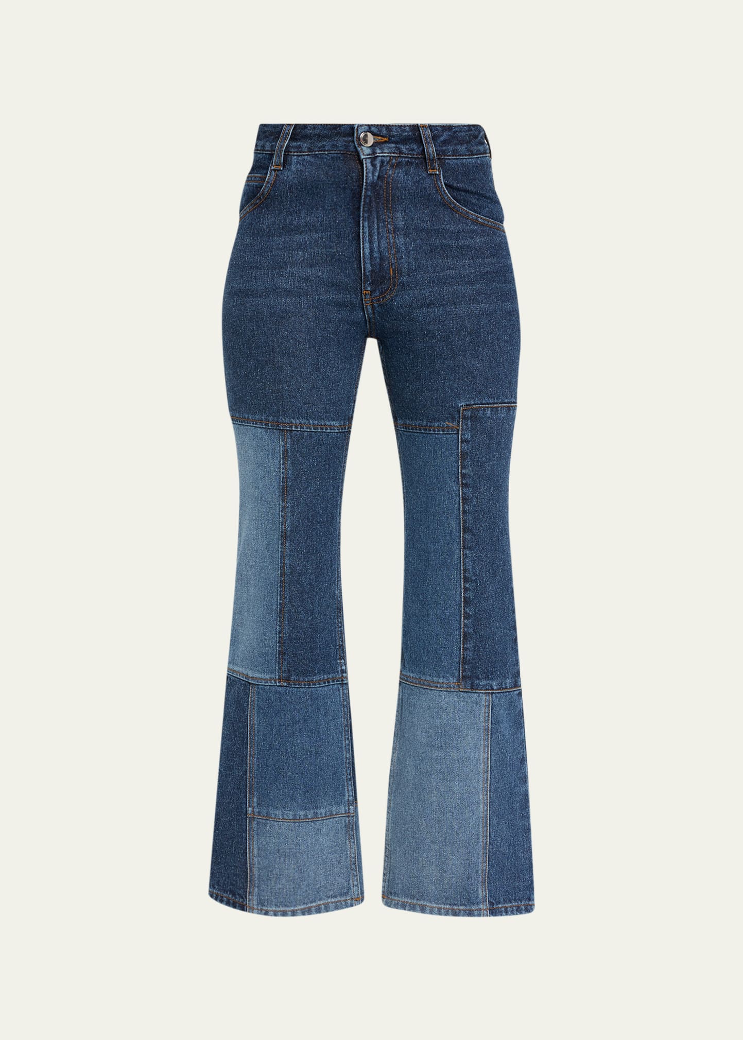 Chloe patchwork denim pants Mid rise Five-pocket style Flare legs Cropped at the ankle Button/zip fly; belt loops Cotton/hemp Professional cleaning recommended Made in Italy