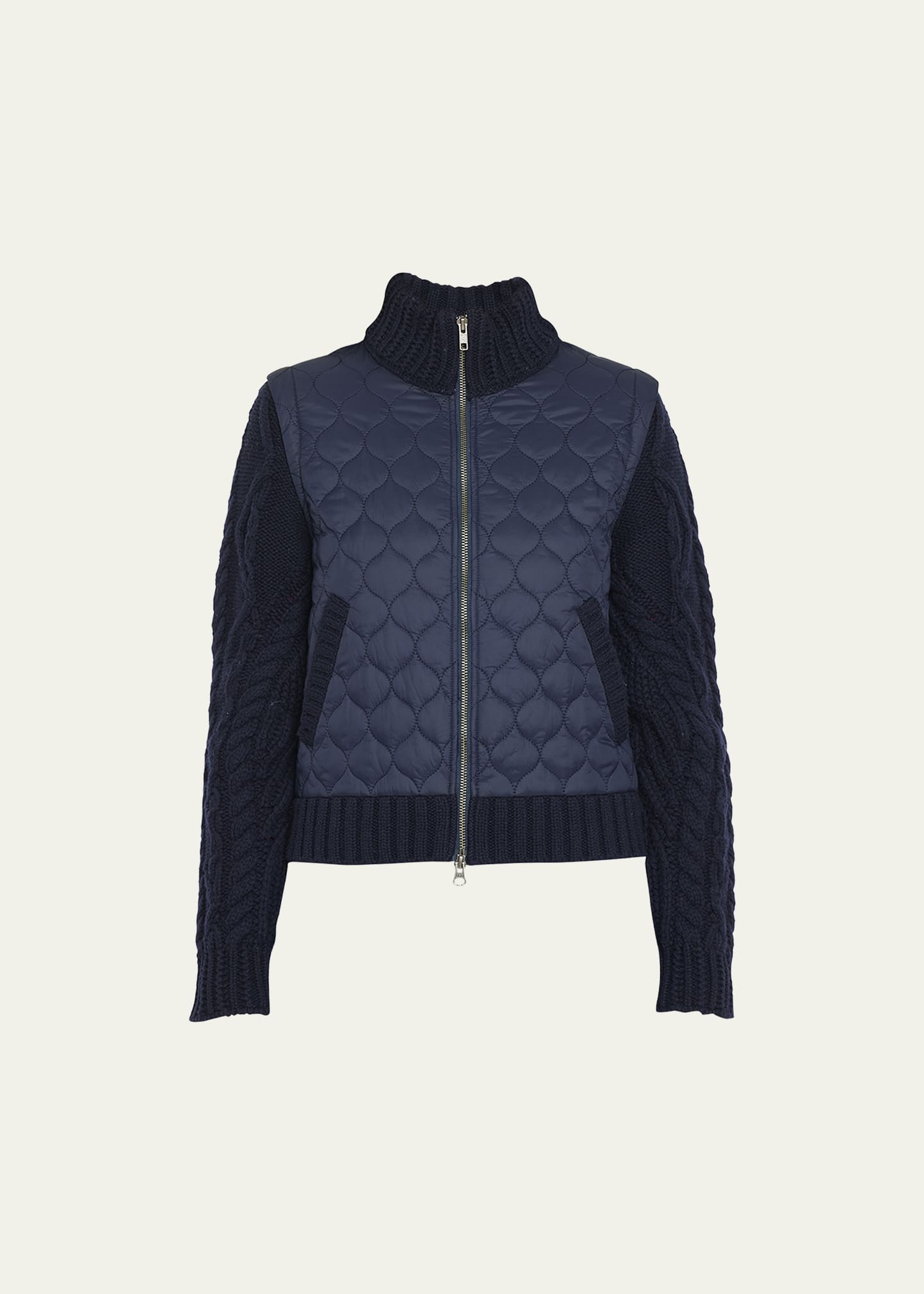 Veronica Beard "Patra" mixed-media jacket featuring a quilted nylon bodice with contrasting wool sleeves and trim Turtleneck Long sleeves Angled welt pockets Easy fit Back split hem Two-way zip front Wool/Amni® nylon Dry clean Imported