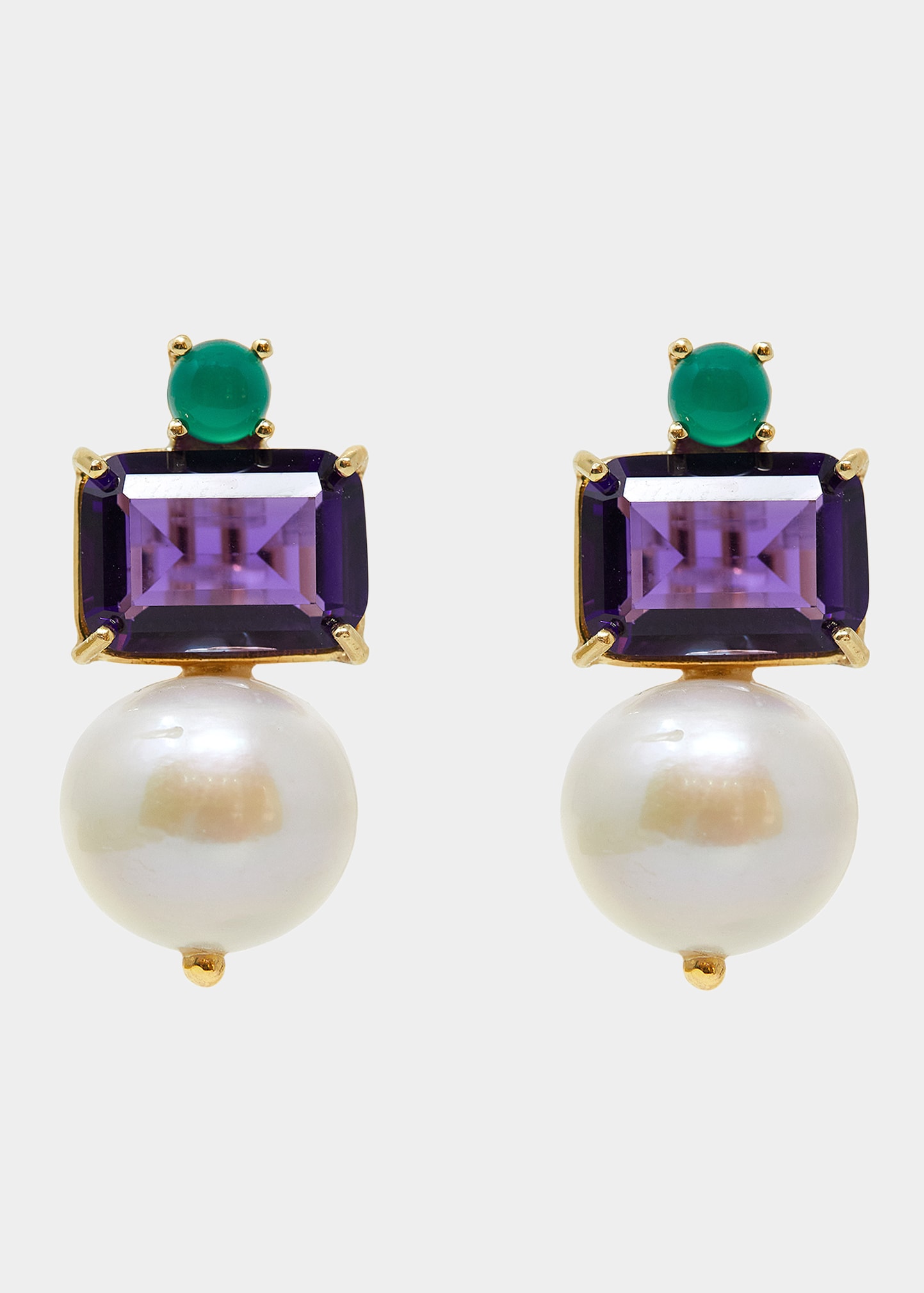 Grazia And Marica Vozza stud drop earrings 14-karat yellow gold studs; 9-karat solid yellow gold stone setting and clip Natural cultured freshwater pearls Semi-precious hydrothermal amethyst and green agate For pierced ears Keep away from perfume and water Made in Italy