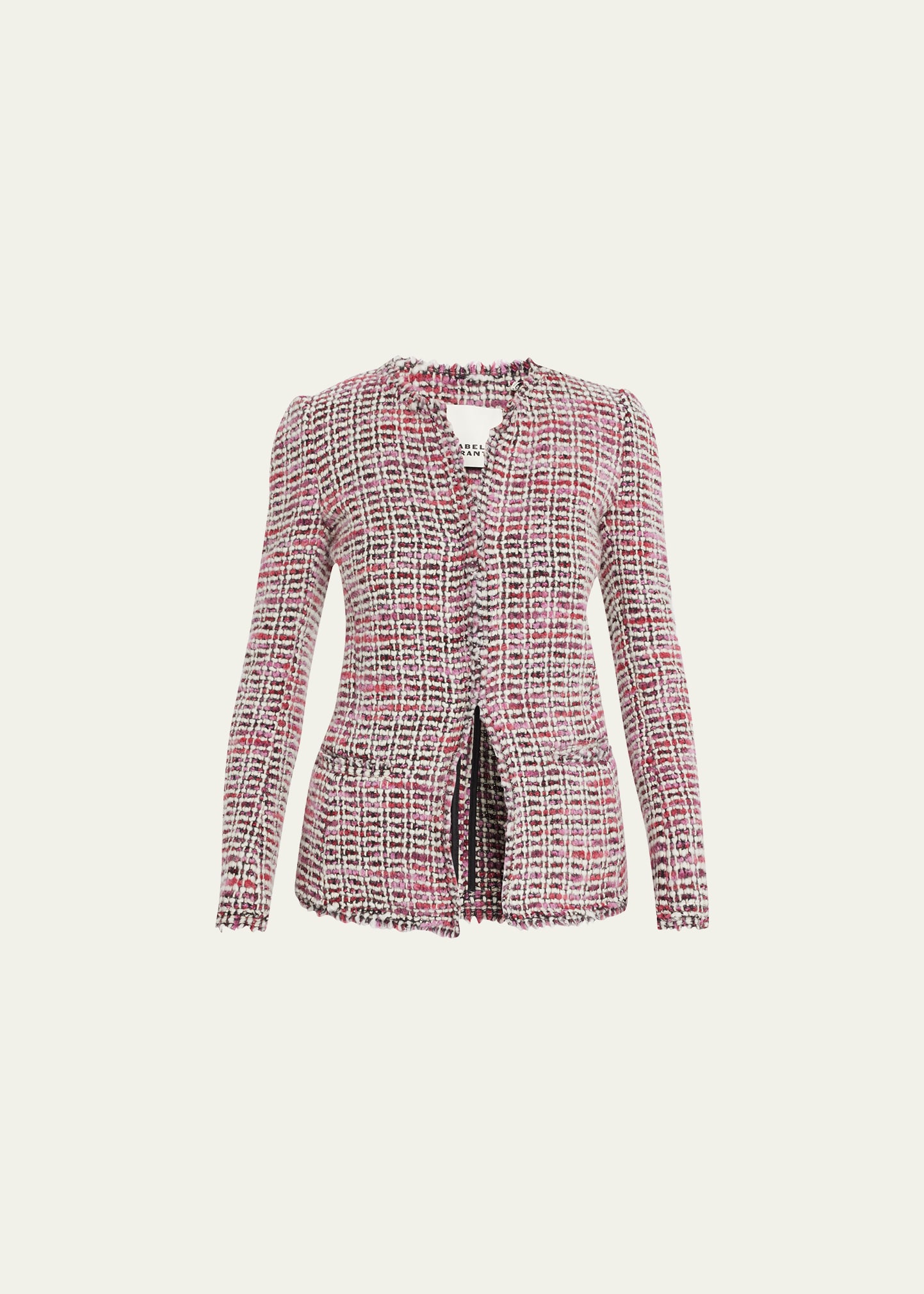 Isabel Marant "Penia" short coat in a tweed styling Round collar Hook and eye front closure Long sleeves Front welt pockets Mid-length Relaxed fit Virgin wool/alpaca/polyamide Made in Poland