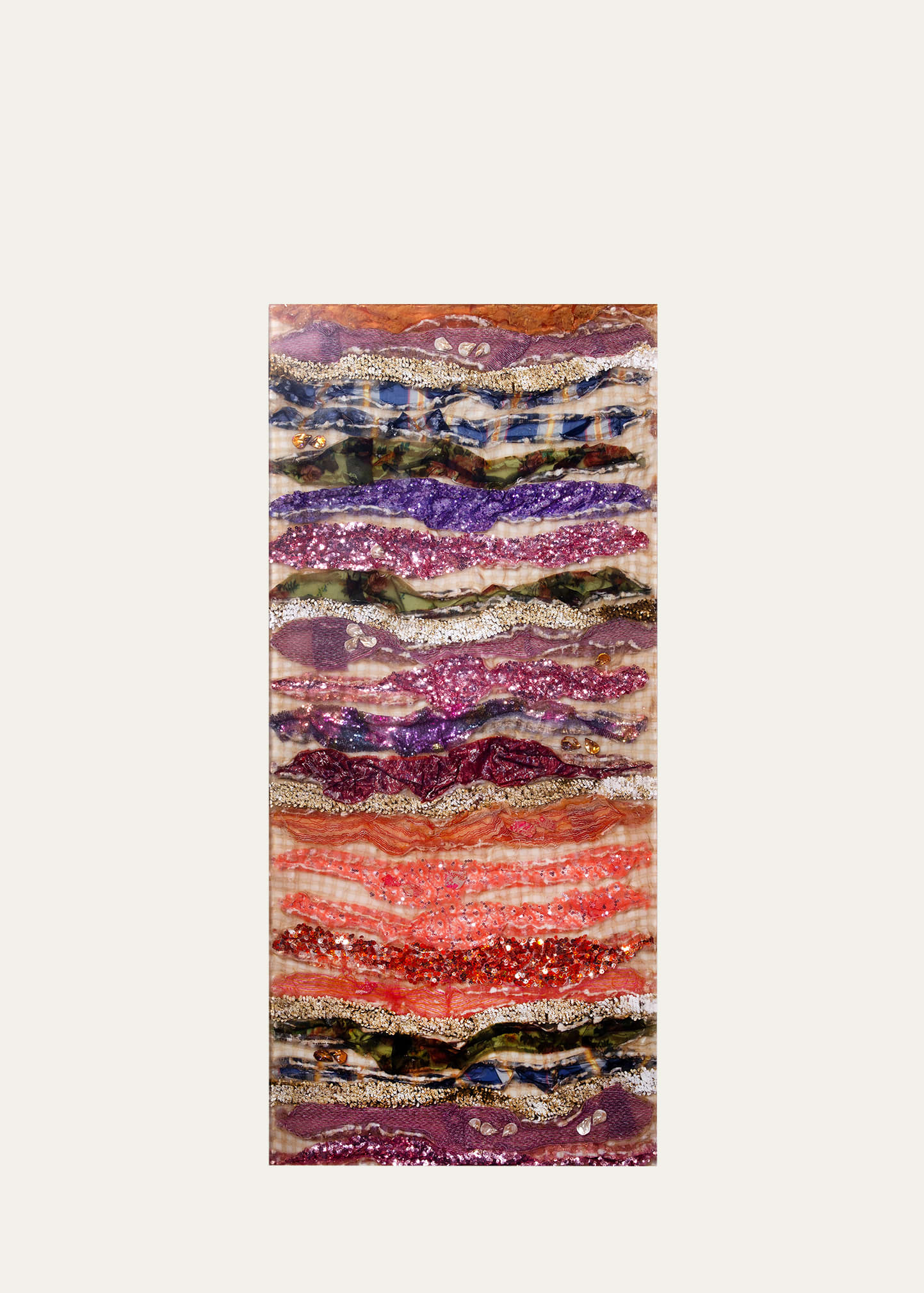 Inspired by the random beauty of piled beach foutas, for sale along the winding roads of the cote d'azur. andre paul croteau, miami artist. Light-reflective "opulent friezes". Hand-poured, resin-layered panels, collaged with sculpted fabrics and objects. The subtleties of varied light absorption and transparency are central to the work, as well as the ideas of transformation, imperfection and chance. Approx. 64"L x 28.5"W Wipe clean Made in Colombia Weight, 75.0lbs Boxed weight, approximately...