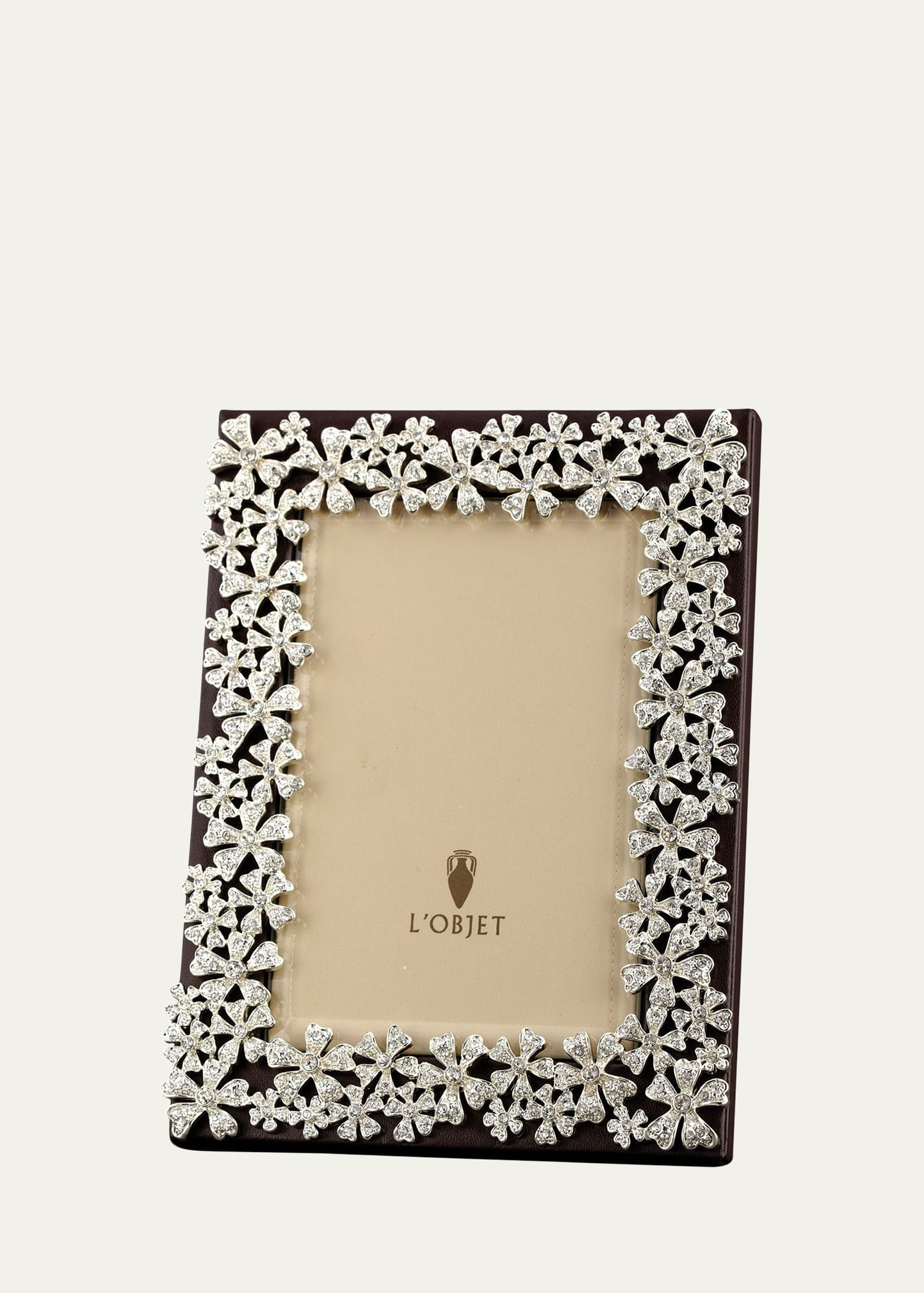 L'Objet platinum-plated frame. White Swarovski crystals. Beveled glass. Satin lining. Leather back. Imported.