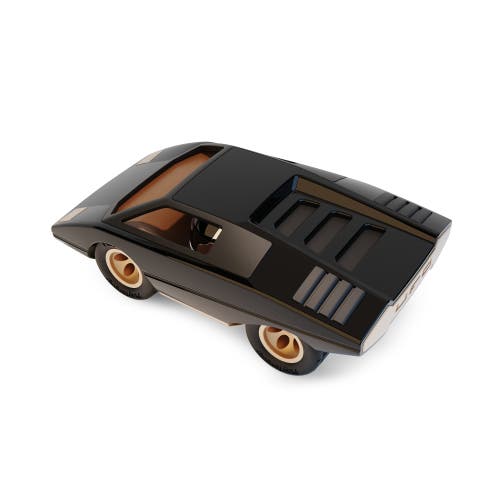 Back in the sixties, supercars were voluptuous, beaten aluminum shells with supermodel curves and organic shapes that looked sculpted out of marble. In Italy, a new generation of designers began working on radical concepts that seemed straight out of the future. Thus began the era of unworldly 1970’s concept cars — wedges on wheels with angular edges, stretched skins, and roof heights dropped to windowsill level. Drivers practically sat on the floor, with windscreens and bonnets forming the same flat plane, while the roar of a V12 engine screamed just behind their heads.\nThough many of these concepts are now forgotten, one became the poster car of the 1980s, inspiring not just automotive design but also sci-fi movies, fighter jets, speedboats, and more. UFO is Playforever’s celebration of dreaming big and embracing radical change. Playforever draws inspiration from classic racing cars and planes of the 1920s, as well as 1960s New York. Their designs mix art, fashion, traditional design, and modernism. All toys feature child-friendly rubber wheels and UV-resistant paint finishes.