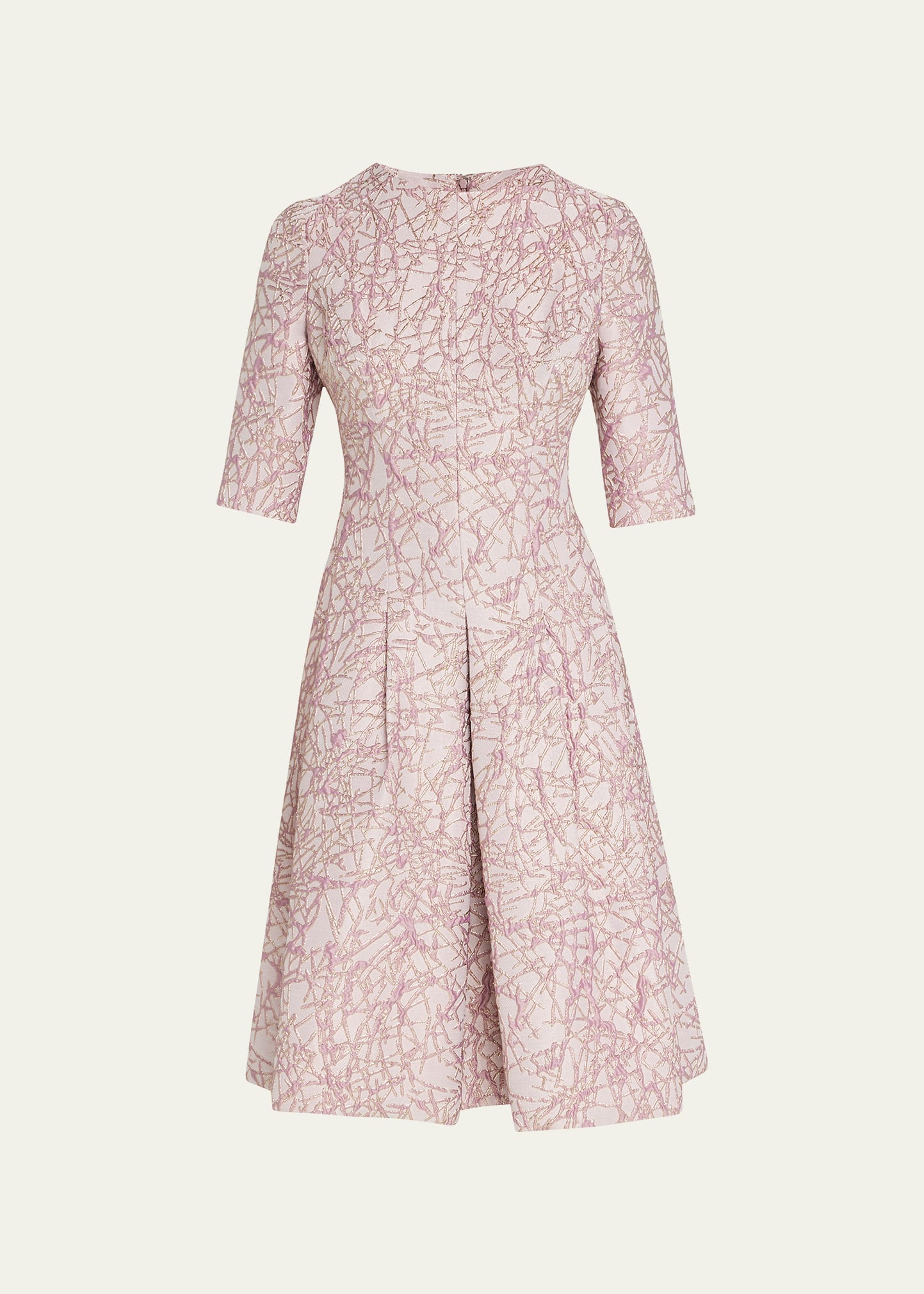 Rickie Freeman for Teri Jon pleated midi dress crafted from textured metallic jacquard Jewel neckline 3/4 sleeves Slit cuffs Hem hits around the knee A-line silhouette Invisible back zipper Polyester/metallic/cotton Lining: Polyester Dry clean Imported