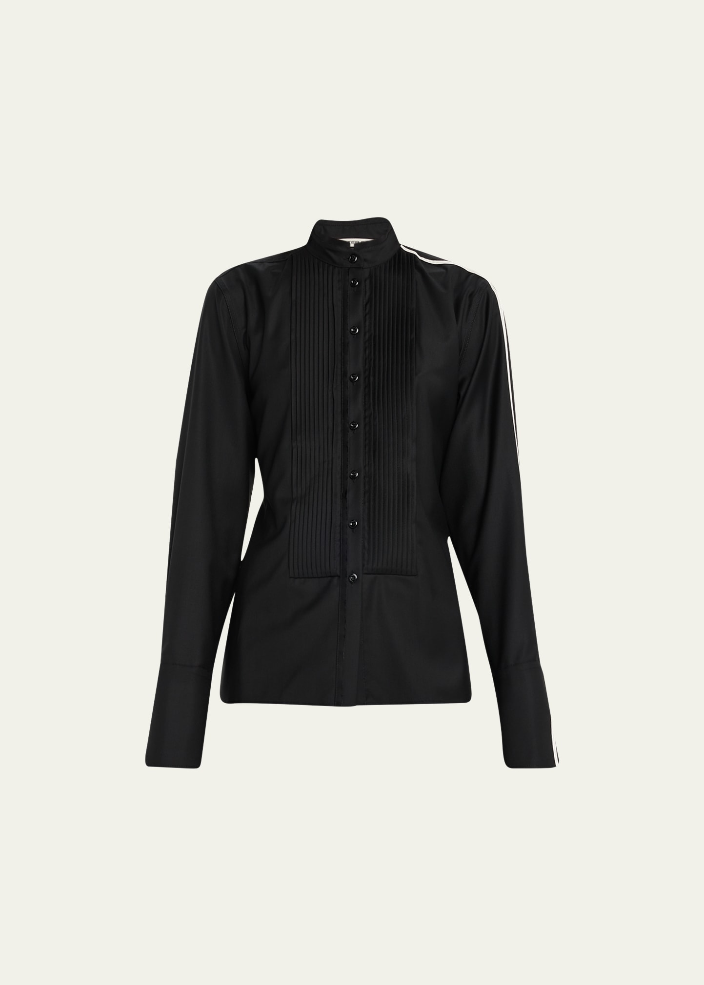 Peter Do tuxedo blouse with signature tattoo line Band collar; button front Pleated bib front Long sleeves; button cuffs Relaxed fit Back yoke; box pleat Button strap at back Virgin wool/viscose/acetate Made in Italy