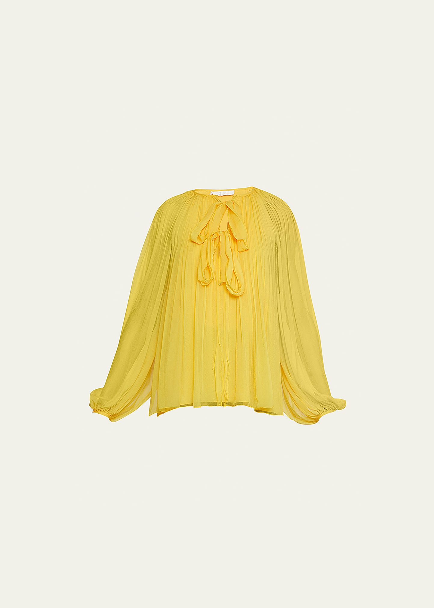 Chloe pleated blouse with self-tie detail Crew neckline Long sleeves Relaxed fit Pullover style Silk Dry clean, professional cleaning recommended Made in France