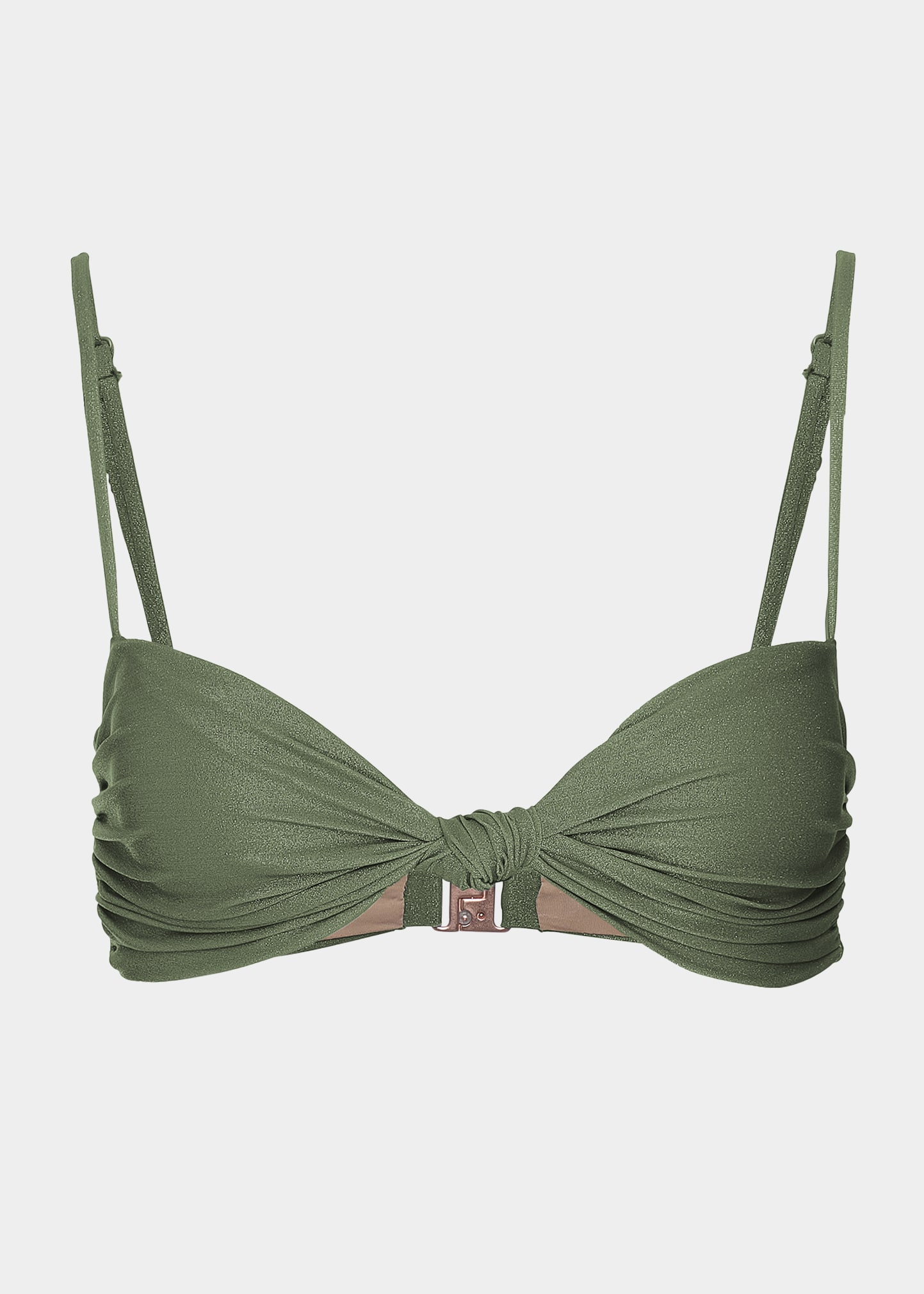 Johanna Ortiz "Pleno Sol" bikini top in a shimmery finish boasts a front knot detail Sweetheart neckline Adjustable straps Mid-back clasps Polyamide/elastane Made in Colombia Bottoms sold separately