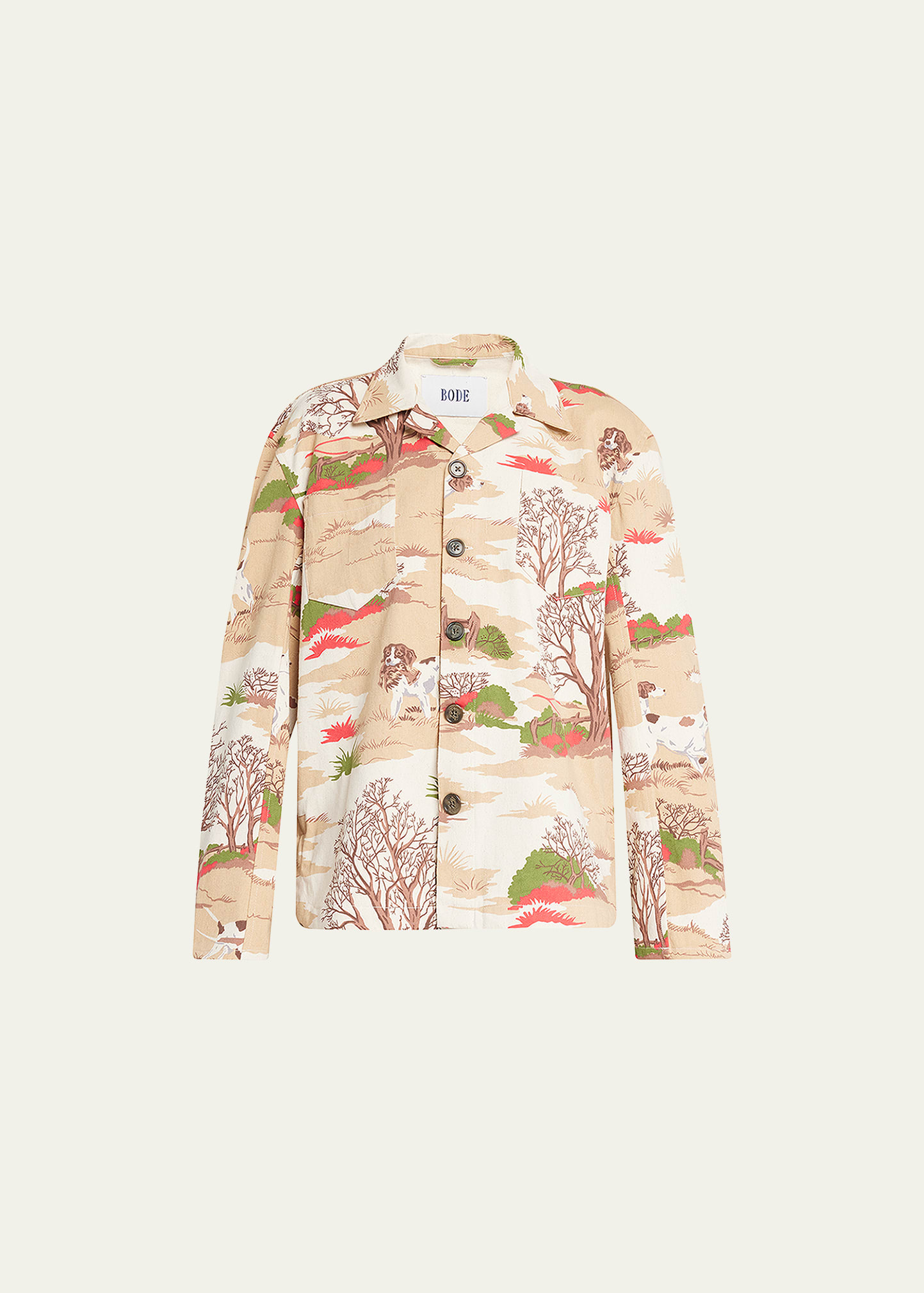 Bode "Pointing Dog" woven printed work shirt Notch lapels; button front Long sleeves Chest patch pockets Boxy fit Curved hem Cotton Imported