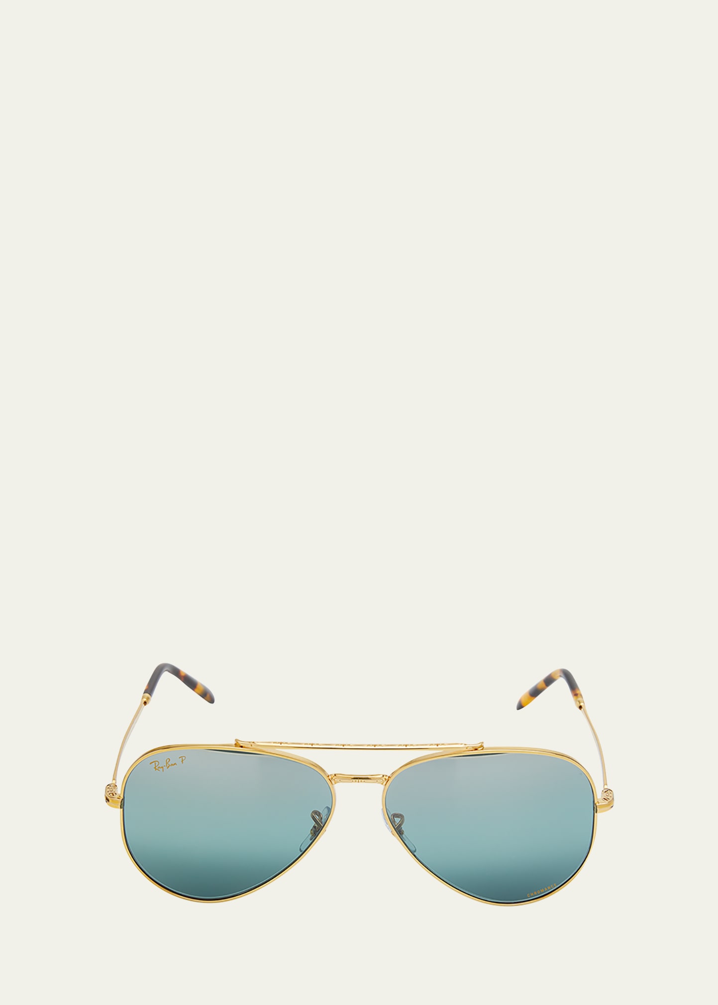 Ray-Ban aviator sunglasses in metal and crystal Lens/bridge/temple (in mm): 62-14-140 Polarized lenses; logo on corner Adjustable nose pads Thin, tapered arms Capped earpieces Style is Rx-able 100% UVA/UVB protection Made in Italy