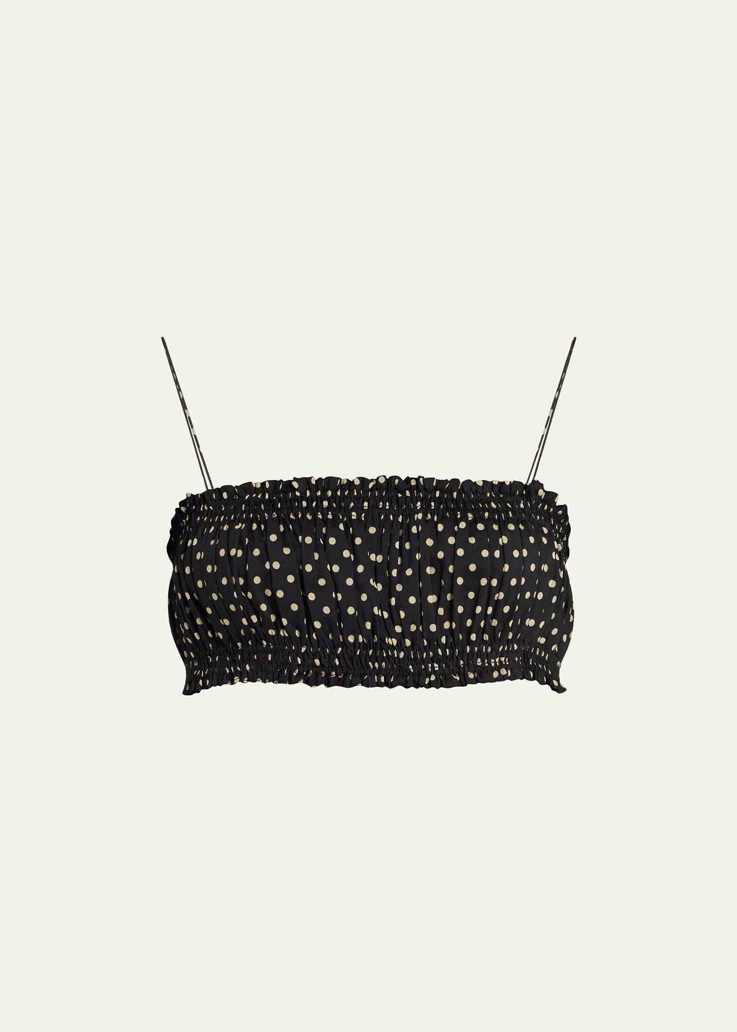 Matteau blouse in a polka dor print with shirred trim Square neckline Fixed spaghetti straps Cropped length Pullover style Organic cotton/silk Made in Australia