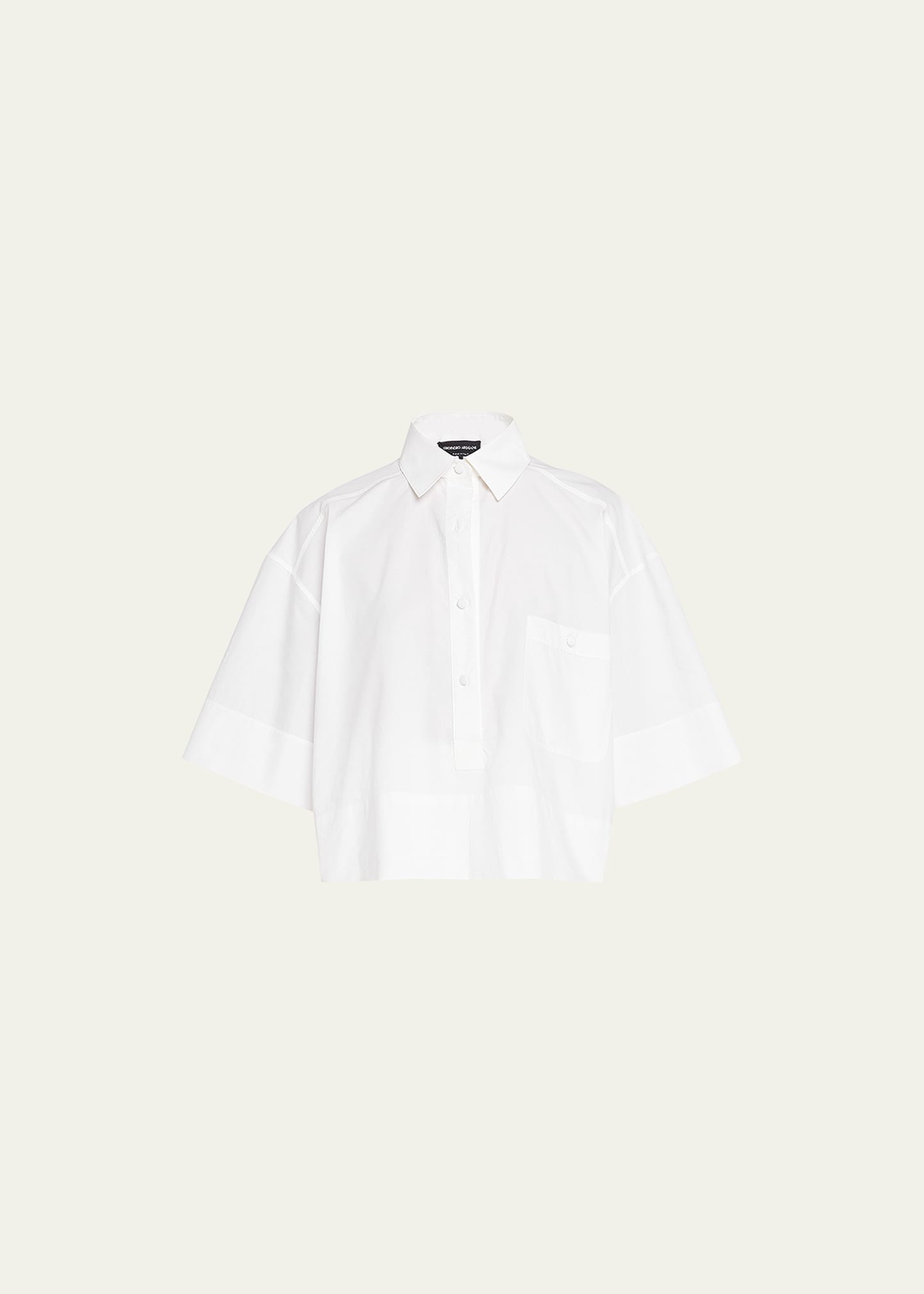 Giorgio Armani poplin blouse with a quarter button-front placket Point collar Short sleeves Front patch pocket Cropped hem Boxy fit Silk/cotton Made in Italy