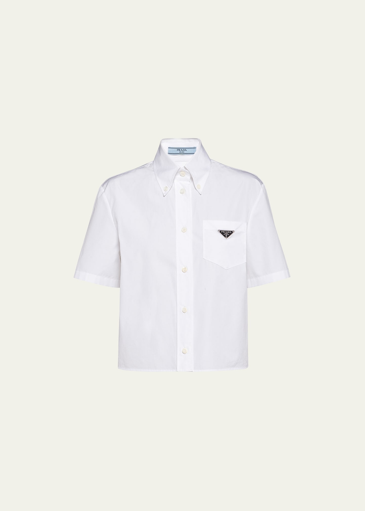 Prada poplin blouse with enameled metal triangle logo Button-down collar; button front Short sleeves Chest patch pocket Straight fit Cropped length Cotton Made in Italy